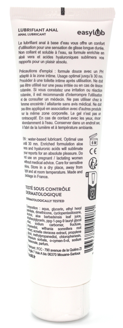 Le lubrifiant Easylub est conçu avec une texture fluide, non grasse et non collante.La présence d’Aloe vera et Hyaluronic lui donne un effet protecteur. Sa composition est à base d’eau et enrichie en extraits de Brède mafane pour lui donner une sensation relaxante. Compatible avec les préservatifs en latex