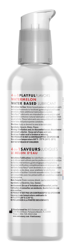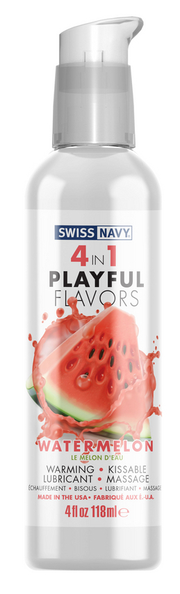 Découvrez le Lubrifiant Aromatisé 4-en-1 Playful Flavors Pastèque de la marque Swiss Navy. Il a un effet chauffant, sert de lubrifiant et d’huile de massage que vous pourrez embrasser à loisir. Flacon doseur de 118 ml