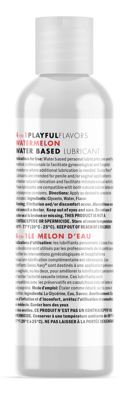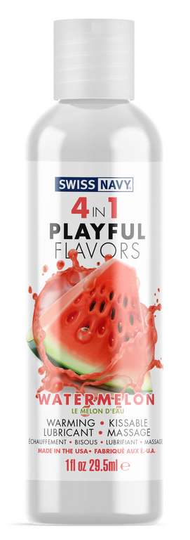 Découvrez le lubrifiant aromatisé 4-en-1 Playful Flavors Pastèque de Swiss Navy. Ce produit offre une sensation chauffante, sert de lubrifiant et d’huile de massage, embrassable. Flacon de 30 ml