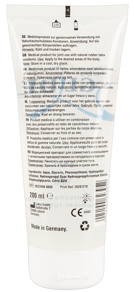 Composition : Aqua, Glycerin, Phenoxyethanol, Hydroxyethylcellulose, Hydroxypropyl Guar Hydroxypropyltrimonium Chloride, Ethylhexylglycerin, Citric Acid Précautions d’utilisation: Conserver dans un endroit sec et à l’abri de la lumière Garder hors de portée des enfants Éviter le contact avec les yeux, la peau abimée et les plaies. En cas d’irritations, arrêter l’usage et de consulter un médecin si cela persiste Tester sur une petite surface. En cas de rougeurs, allergies ou gênes, ne pas utiliser Ce lubrifiant n’est pas un contraceptif. Il ne contient pas de spermicide Ne pas avaler