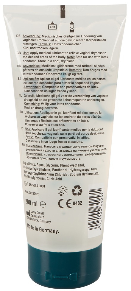 Composition : Aqua, Glycerin, Hydroxyethylcellulose, Phenoxyethanol, Panthenol, Hydroxypropyl Guar Hydroxypropyltrimonium Chloride, Sodium Hyaluronate, Ethylhexylglycerin, Citric Acid Précautions d’utilisation: Conserver dans un endroit sec et à l’abri de la lumière Garder hors de portée des enfants Éviter le contact avec les yeux, la peau abimée et les plaies. En cas d’irritations, arrêter l’usage et de consulter un médecin si cela persiste Tester sur une petite surface. En cas de rougeurs, allergies ou gênes, ne pas utiliser Ce lubrifiant n’est pas un contraceptif. Il ne contient pas de spermicide Ne pas avaler