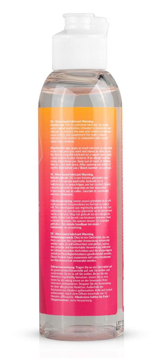Ingrédients du lubrifiant chauffant: Aqua, glycerin, hydroxyethylcellulose, benzyl nicotinate, carbomer, citric acid, polysorbate 80, propylene glycol, tromethamine, potassium sorbate, sodium benzoate. Précautions d’utilisation: Conserver dans un endroit sec et à l’abri de la lumière Garder hors de portée des enfants Éviter le contact avec les yeux, la peau abimée et les plaies. En cas d’irritations, arrêter l’usage et de consulter un médecin si cela persiste Tester sur une petite surface. En cas de rougeurs, allergies ou gênes, ne pas utiliser Ce lubrifiant n’est pas un contraceptif. Il ne contient pas de spermicide Ne pas avaler