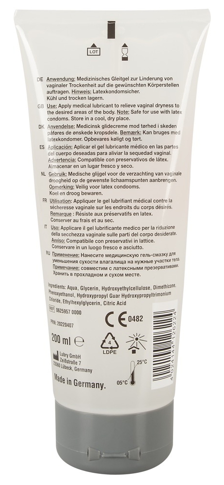 Composition : Aqua, Glycerin, Hydroxyethylcellulose, Dimethicone, Phenoxyethanol, Hydroxypropyl Guar Hydroxypropyltrimonium Chloride, Ethylhexylglycerin, Citric Acid. Précautions d’utilisation: Conserver dans un endroit sec et à l’abri de la lumière Garder hors de portée des enfants Éviter le contact avec les yeux, la peau abimée et les plaies. En cas d’irritations, arrêter l’usage et de consulter un médecin si cela persiste Tester sur une petite surface. En cas de rougeurs, allergies ou gênes, ne pas utiliser Ce lubrifiant n’est pas un contraceptif. Il ne contient pas de spermicide Ne pas avaler