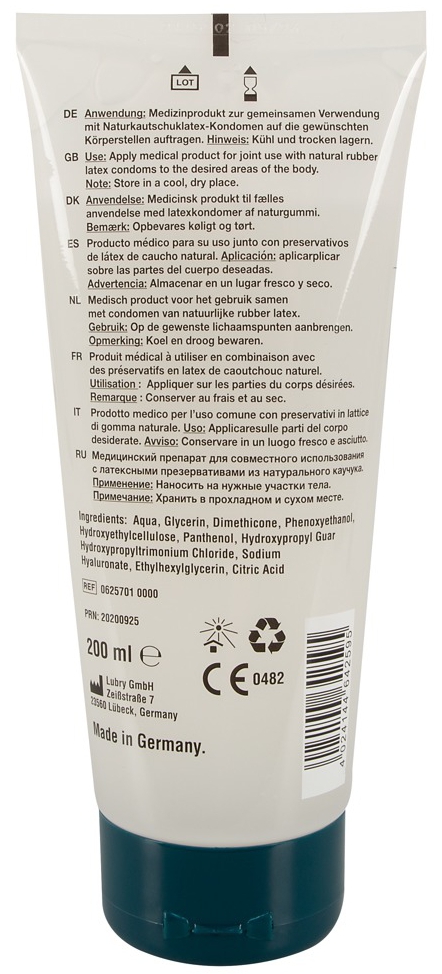 Composition : Aqua, Glycerin, Hydroxyethylcellulose, Dimethicone, Phenoxyethanol, Panthenol, Hydroxypropyl Guar Hydroxypropyltrimonium Chloride, Sodium Hyaluronate, Ethylhexylglycerin, Citric Acid Précautions d’utilisation: Conserver dans un endroit sec et à l’abri de la lumière Garder hors de portée des enfants Éviter le contact avec les yeux, la peau abimée et les plaies. En cas d’irritations, arrêter l’usage et de consulter un médecin si cela persiste Tester sur une petite surface. En cas de rougeurs, allergies ou gênes, ne pas utiliser Ce lubrifiant n’est pas un contraceptif. Il ne contient pas de spermicide Ne pas avaler