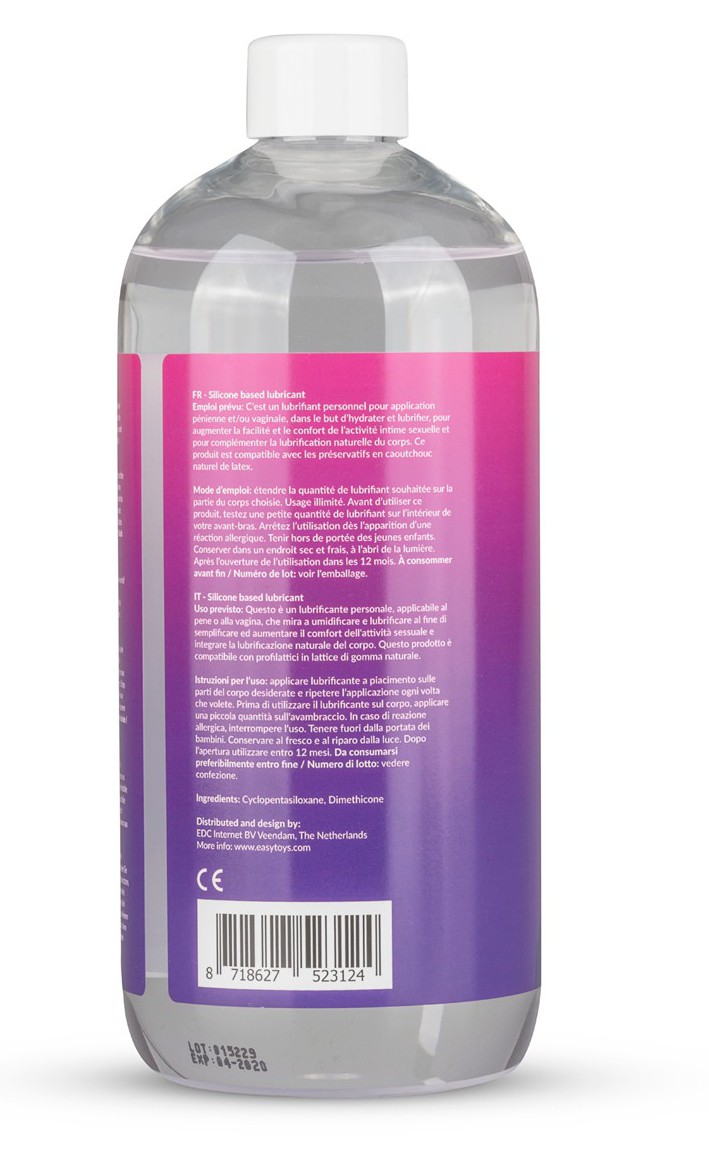 Attention : ne pas utiliser ce lubrifiant avec des sextoys en silicone. Ingrédients :Cyclopentasiloxane, dimenthycone Précautions d’utilisation: Conserver dans un endroit sec et à l’abri de la lumière Garder hors de portée des enfants Éviter le contact avec les yeux, la peau abimée et les plaies. En cas d’irritations, arrêter l’usage et de consulter un médecin si cela persiste Tester sur une petite surface. En cas de rougeurs, allergies ou gênes, ne pas utiliser Ce lubrifiant n’est pas un contraceptif. Il ne contient pas de spermicide Ne pas avaler
