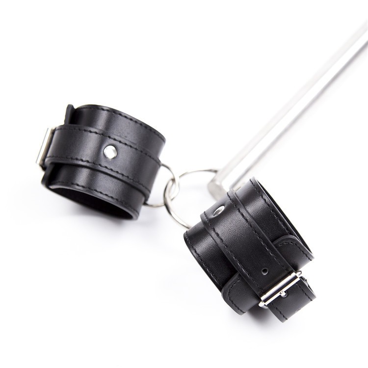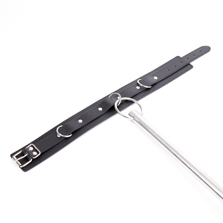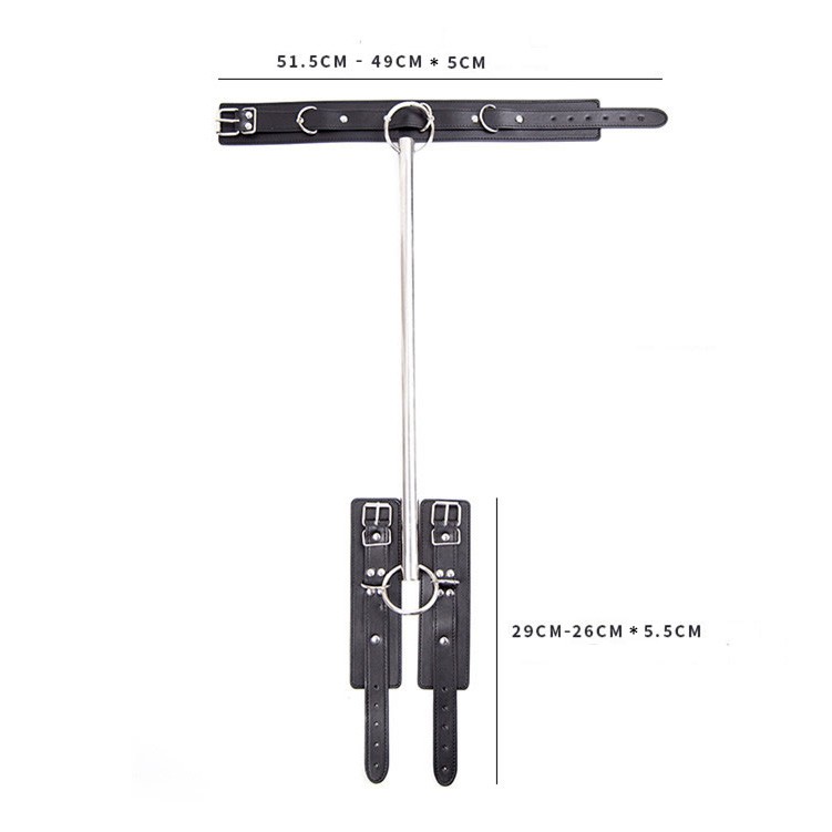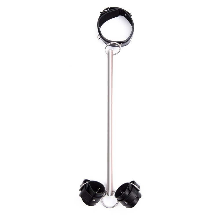 Cet accessoire de maintien permet de tenir les poignets attachés fermement et reliés au cou.La position est ainsi tenue et les mouvements impossibles. La barre métallique mesure 50cm.Les menottes sont réalisées en faux cuir