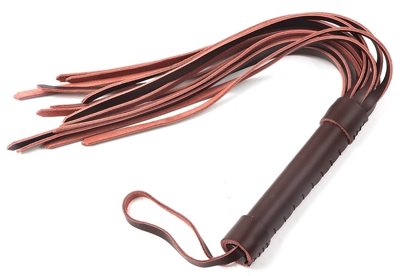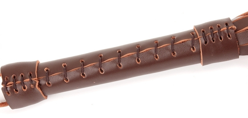 Martinet marron de 49 cm au total Lanières de 33 cm en cuir Manche en bois, recouvert de cuir de 16 cm de long pour 2.5 cm de large. Petite anse au bout pour un maintien au poignet.