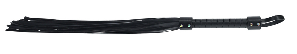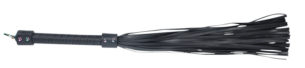 Martinet noir d’une longueur totale de 54 cm. Lanières de 34 cm, avec des attaches multicolores irisées. En simili.