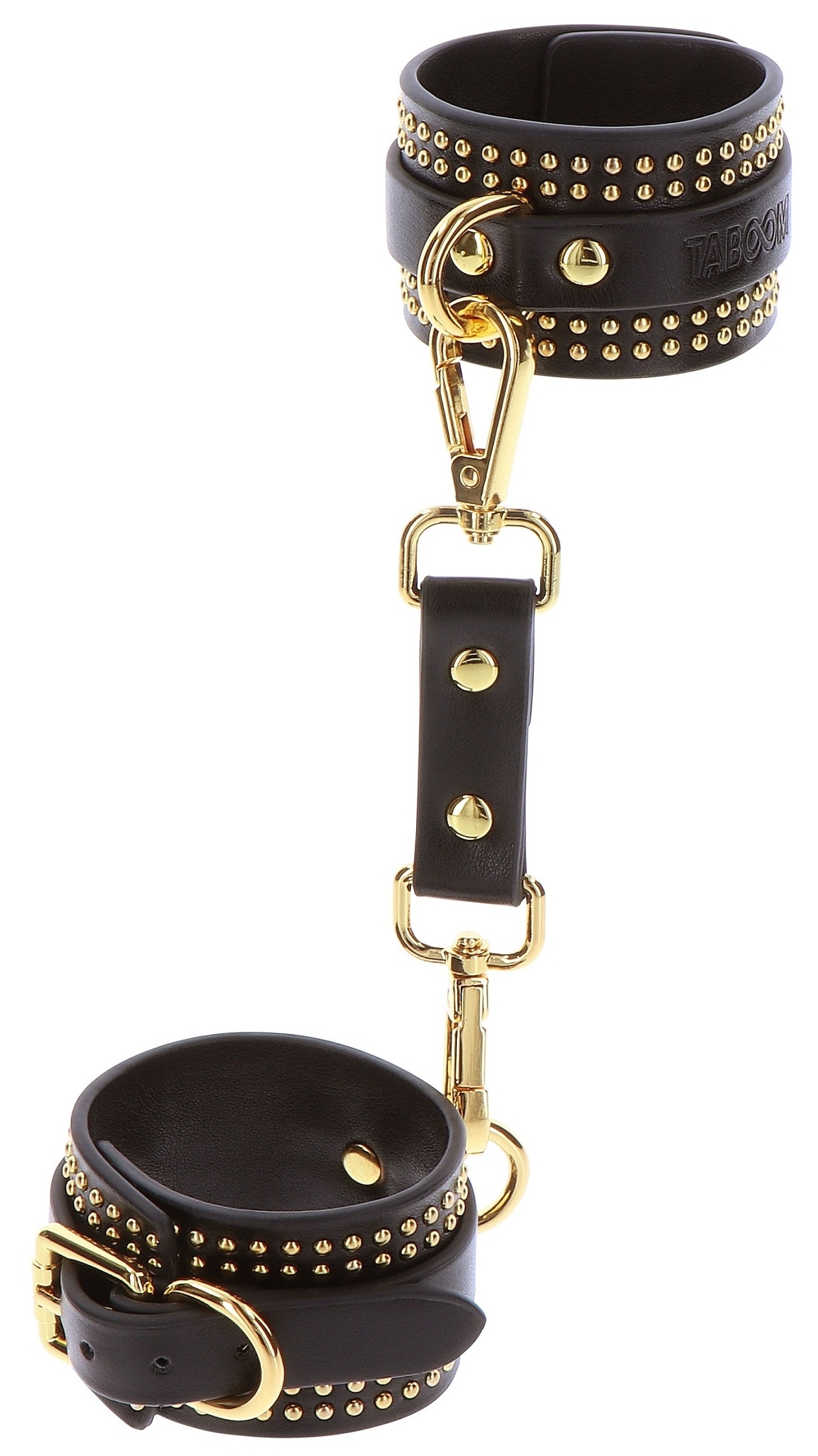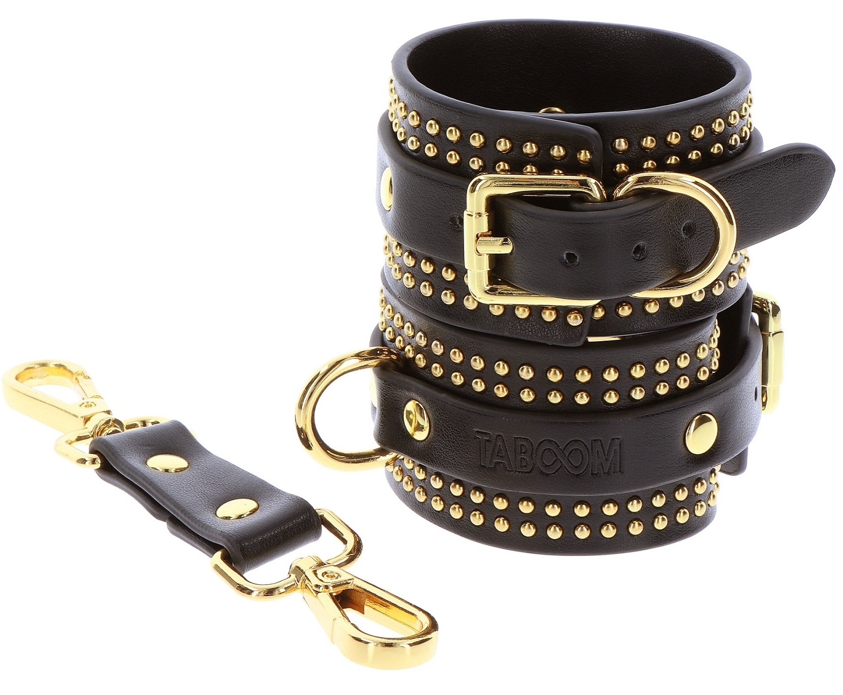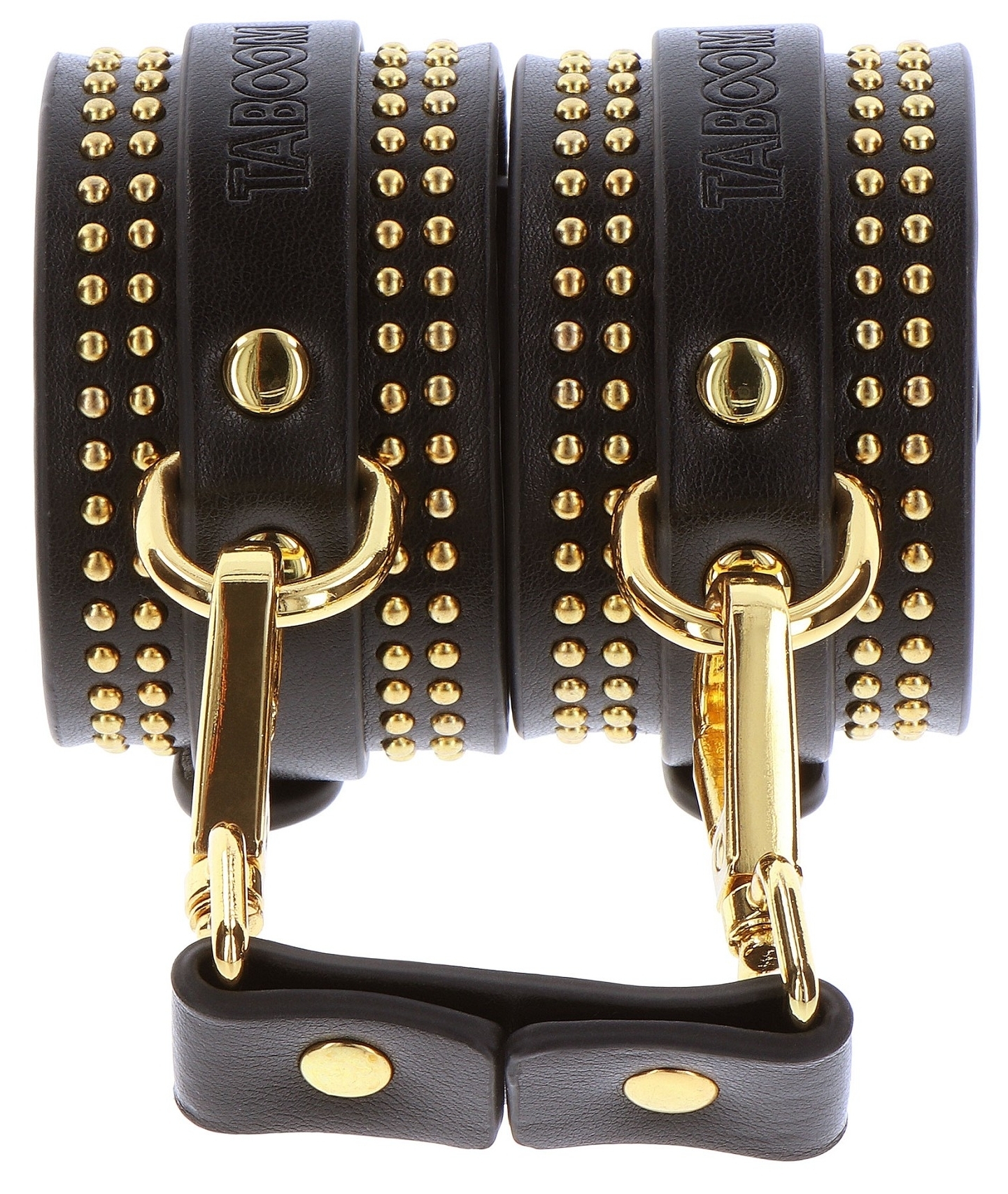 Menottes de chevilles noires avec des éléments métalliques et dorés. La largeur est de 4.5 cm. Tour de cheville de 23.5 à 30.5 cm. Longueur de l’attache de 14.5 cm. En simili (polyuréthane).