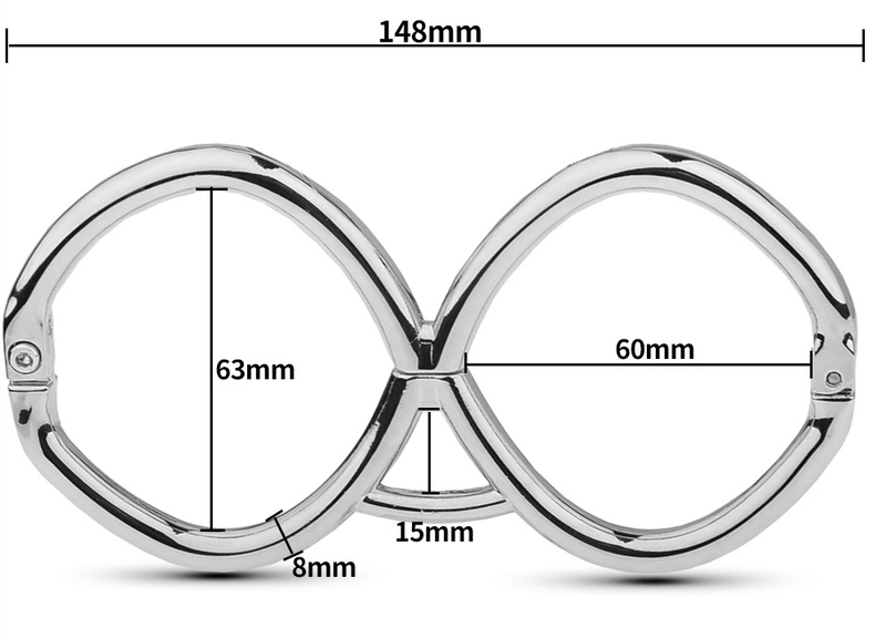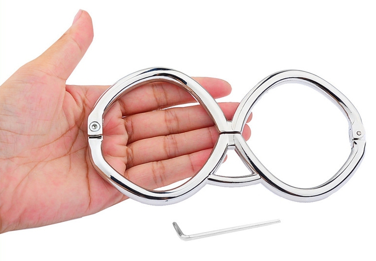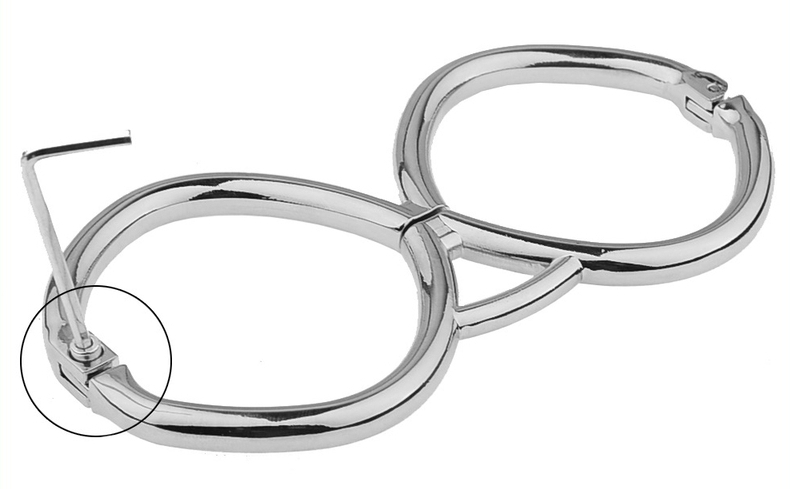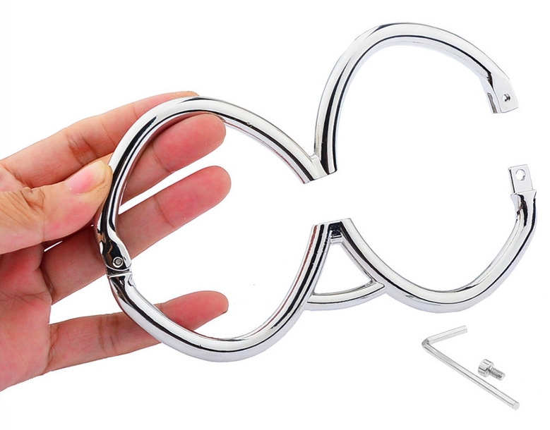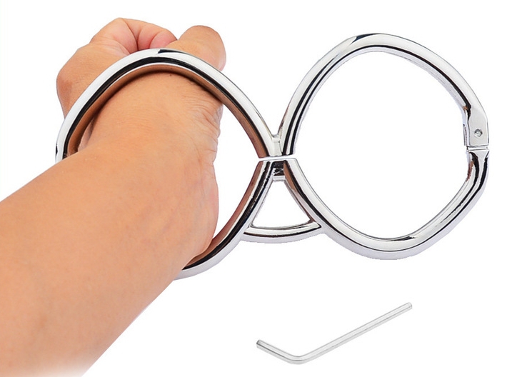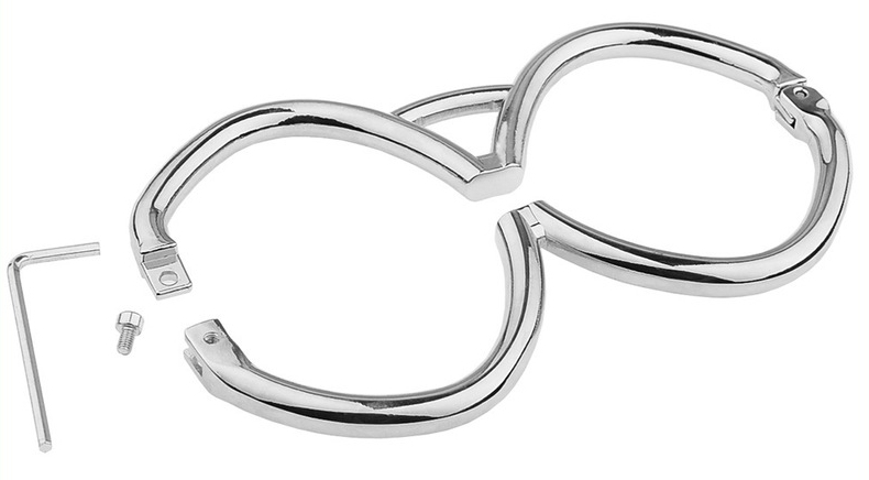 Ces menottes en métal Hex sont conçue d’un seul tenant avec 2 anneaux de 6cm de diamètre se fermant directement sur les poignets.La longueur est de 15cm.La fermeture se fait avec une clé allen (fournie). Épaisseur de 8mm.