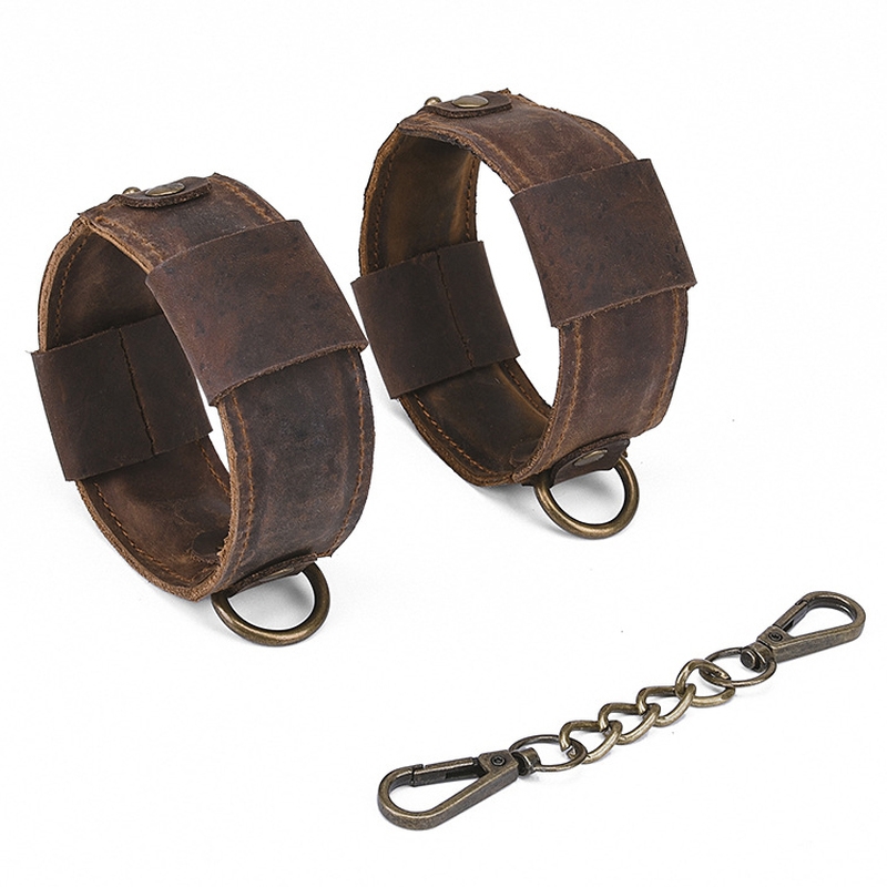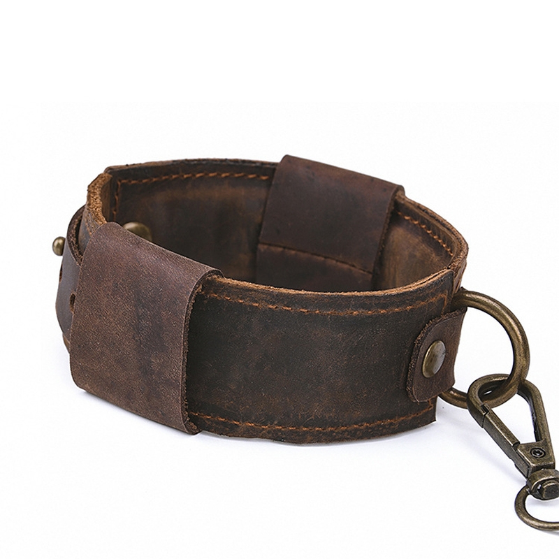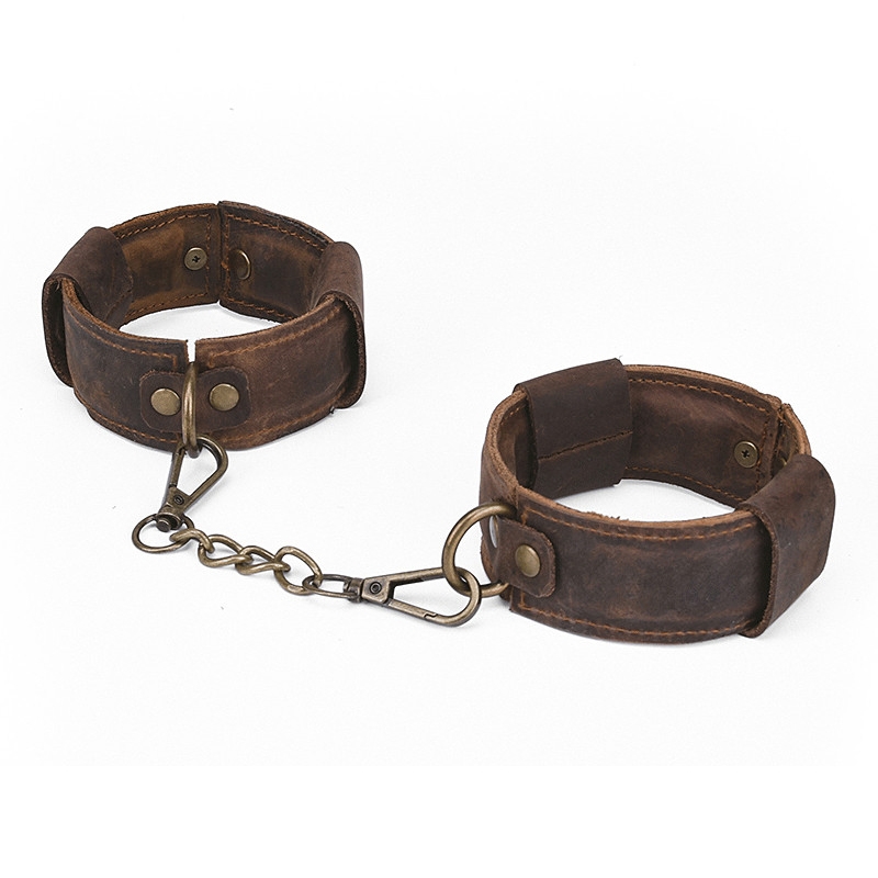 Menottes de poignets style vintage marron. Attaches en métal style vintage. Dimensions : Longueur de 19 à 24 cm. Largeur de 3.5 cm. En cuir.