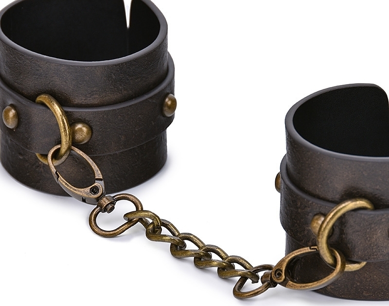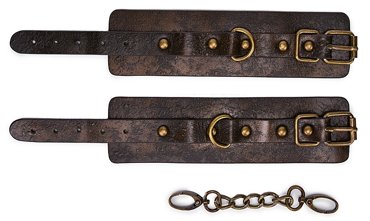 Menottes de poignets en cuir marron vieilli. Chaîne en métal doré Dimensions : Longueur de 18 à 24 cm. Largeur de 6 cm. En cuir et métal