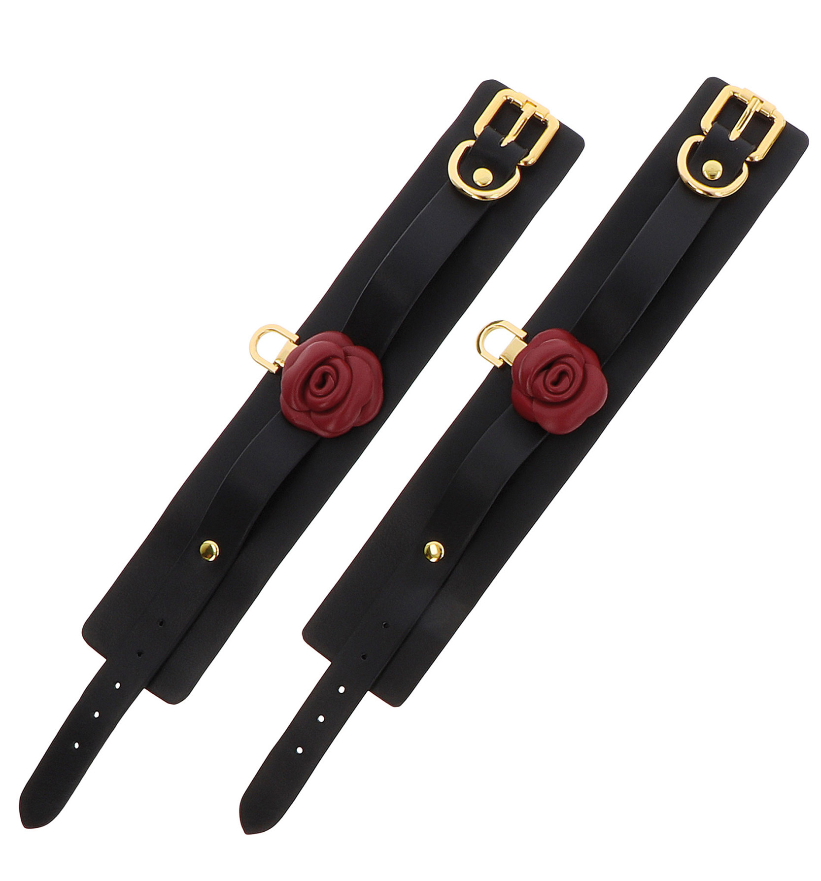 Menottes de poignets noires avec rose rouge et attaches dorées. Longueur ajustable de 19 à 24 cm et largeur de 4.5 cm pour votre confort Attaches de 16 cm de longueur En simili noir et rose en cuir