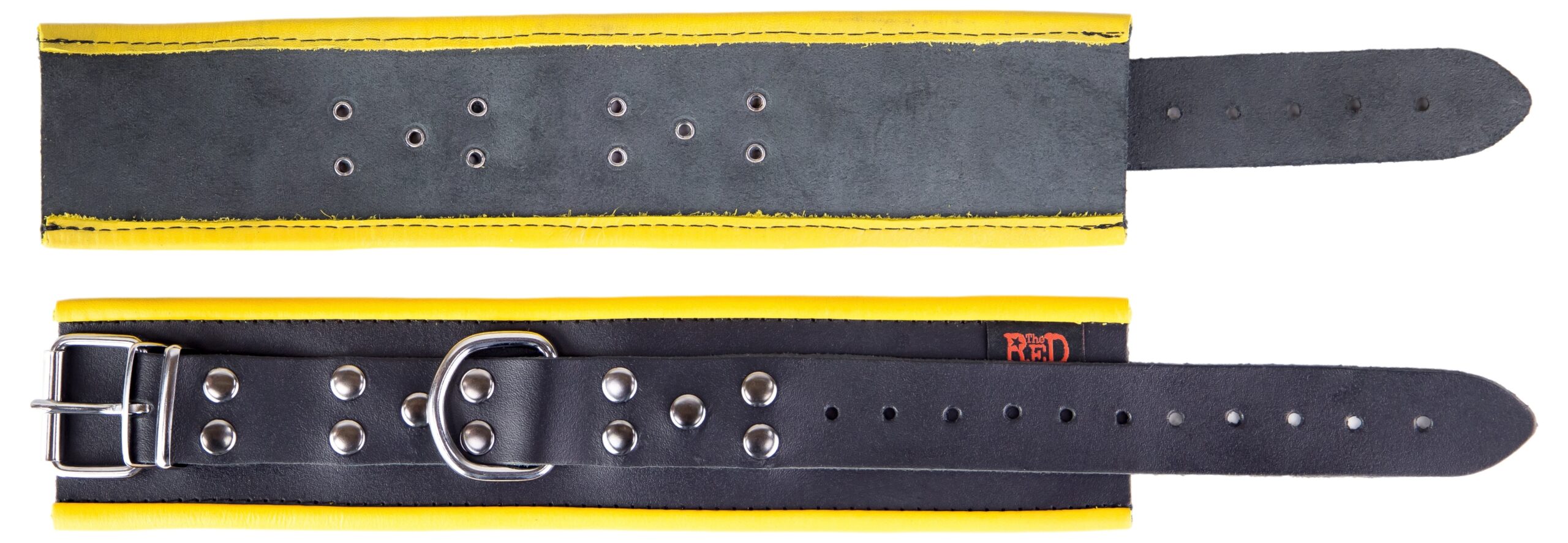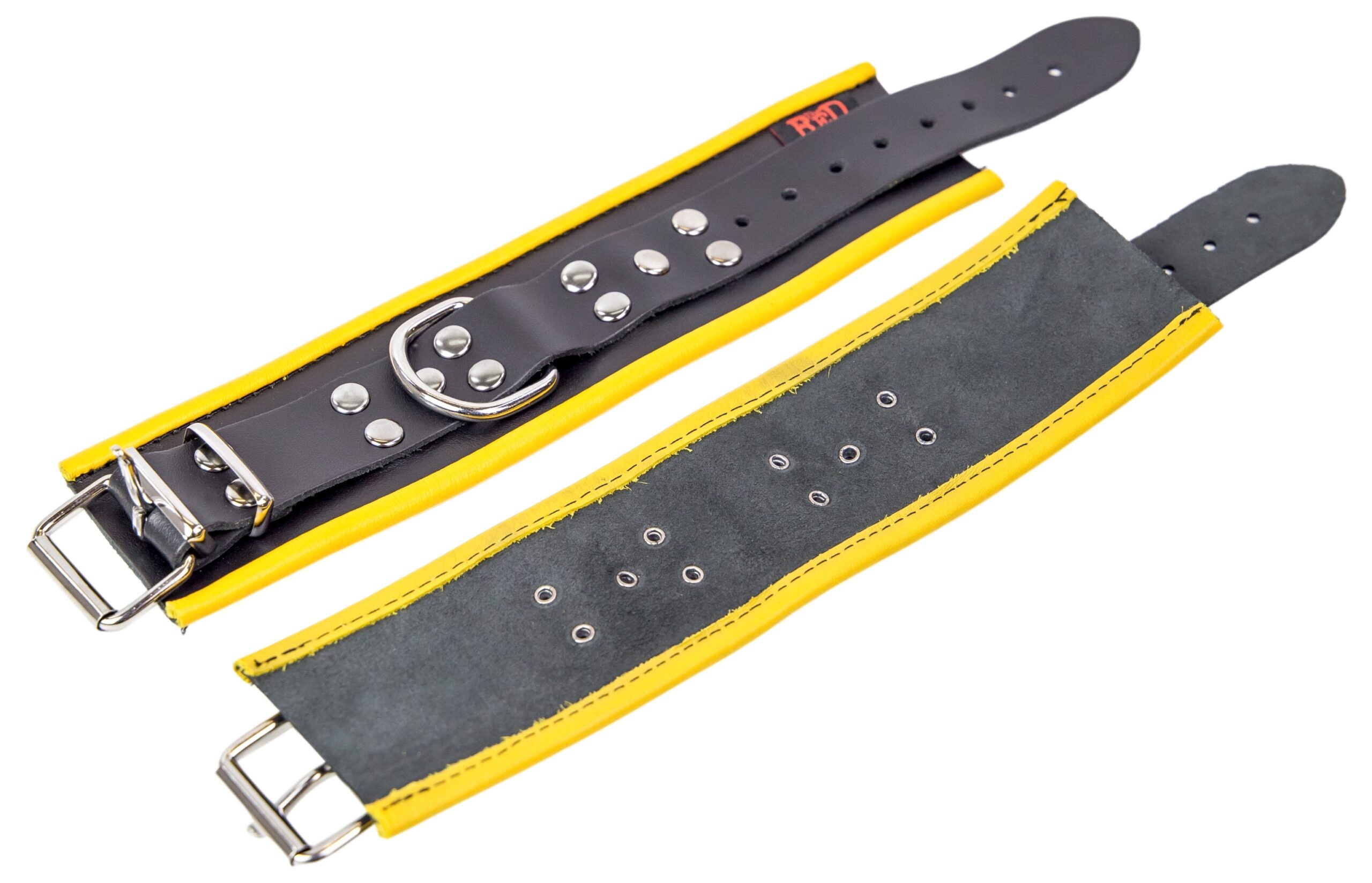 Ces menottes en cuir sont idéales pour attacher les chevilles. Elles sont composées d’une fine épaisseur et de bordures jaunes.Largeur de 6.5cm. Tour ajustable allant de 22 à 38cm. En cuir véritable de vache. Tannage végétal.Fabriqué en Europe