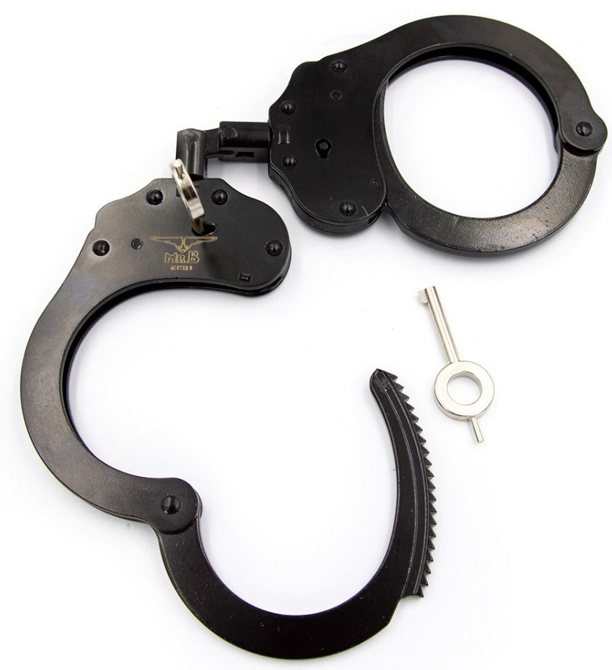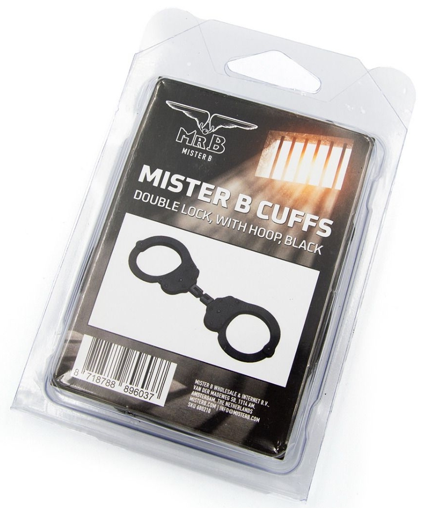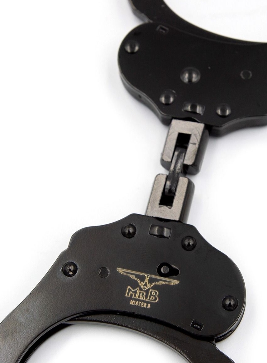 Ces menottes en métal noires de la marque Mister B sont réalisées avec une charnière solide et efficace pour maintenir les poignets attachés.Les ouvertures ont un diamètre maximum de 50mm. Avec deux clés pour ouvrir. Attention : pas d’ouverture de sécurité