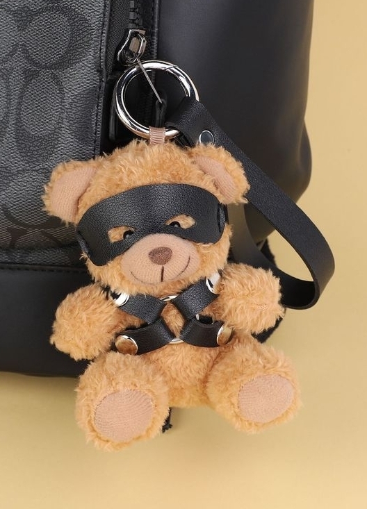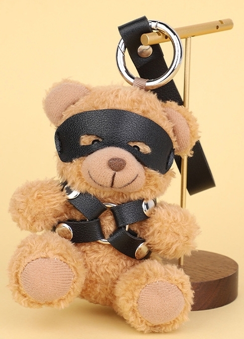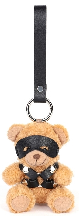 Ours en peluche, marron, SM porte-clés avec une dragonne. Avec un masque et un harnais noirs. Dimensions : 12 x 10 x 6.5 cm En polyester, garnissage intérieur et simili noir.