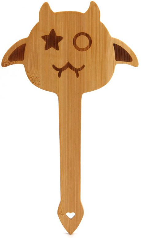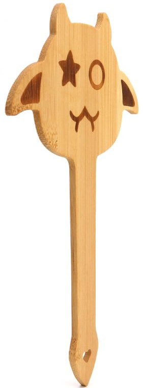 Paddle représentant une chauve-souris. Manche de 15.5 cm et longueur totale de 25 cm. Largeur maximale de 14 cm. En bambou