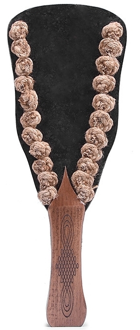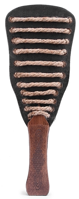Paddle en cuir avec cordes d’une largeur de 13.5 cm. Longueur totale de 37 cm. La partie en cuir est souple, le manche est en bois gravé. Dessous avec noeuds de corde.