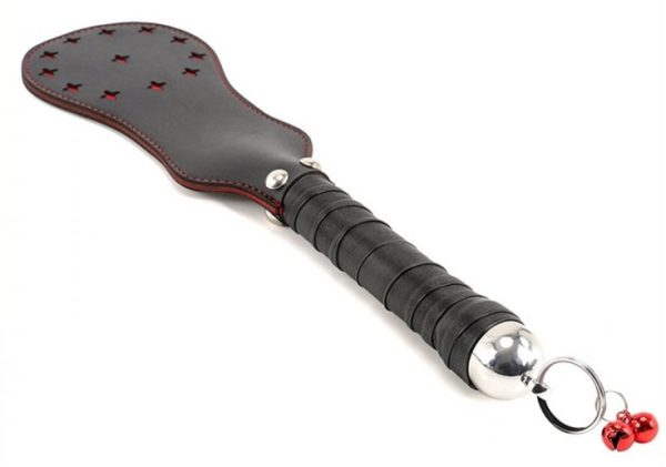 Ce paddle en simili est conçu avec la partie haute de 17 x 10cm avec une forme arrondie et des étoiles rouges en surface.Le manche possède des grelots rouges. Longueur totale de 35cm.En simili (polyuréthane)