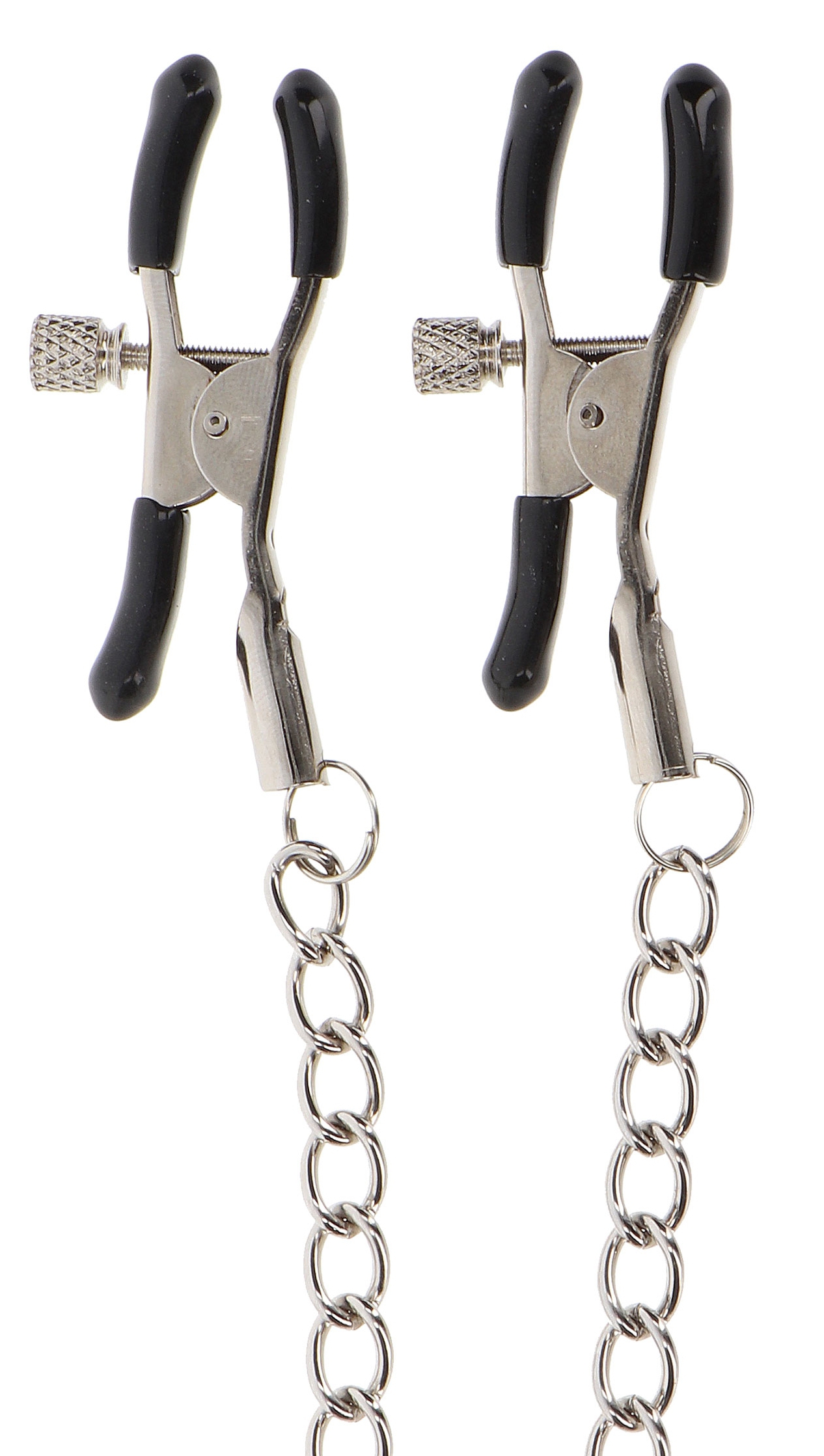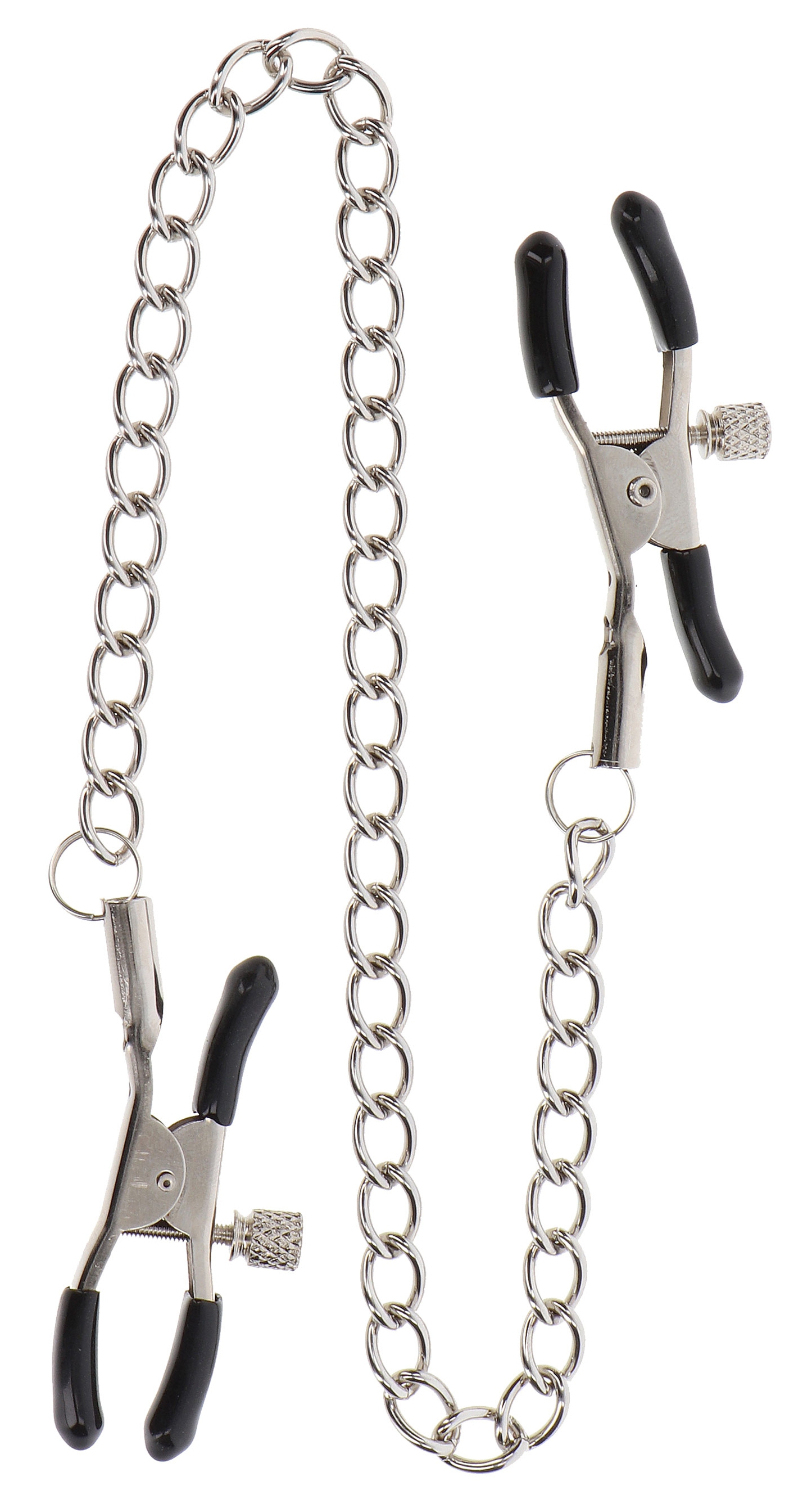 Ces pinces pour les tétons sont ajustables et comportent une chaîne qui de relie les deux tétons.Elles permettent des sensations plaisantes et excitantes. L’extrémité est protégée par un embout caoutchouc.Longueur totale de 39cm. En métal