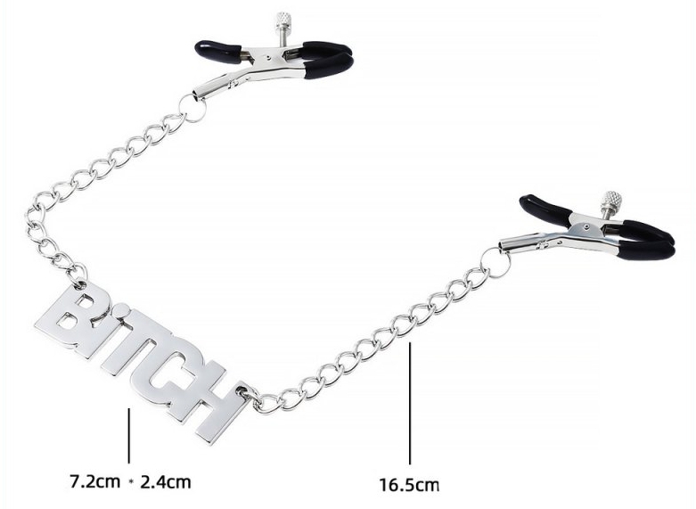 Ces pince-tétons sont composées d’une plaque avec le mot « Bitch » pour montrer encore mieux la soumission du partenaire.Les pinces ont les extrémités protégées. Elles sont ajustables. La longueur totale est de 40cm. Fabriquées en métal