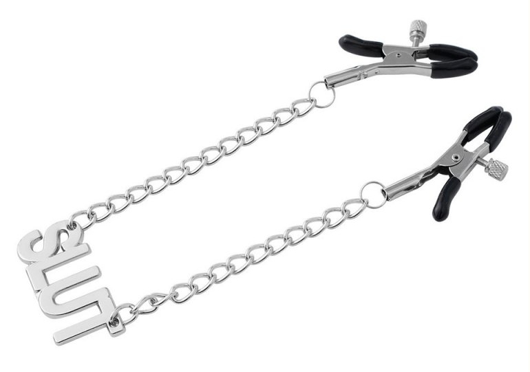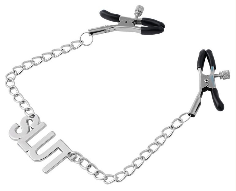 Ces pince-tétons sont composées d’une plaque avec le mot « Slut » (dimensions 5.5 x 2.5cm) qui montre bien qui est le soumis.Avec des pinces ajustables et l’extrémité protégées. La longueur totale est de 38cm. En métal