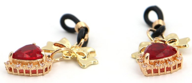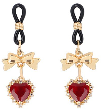 Pinces à tétons ajustables avec un petit noeud et un coeur rouge entouré de strass. En métal doré