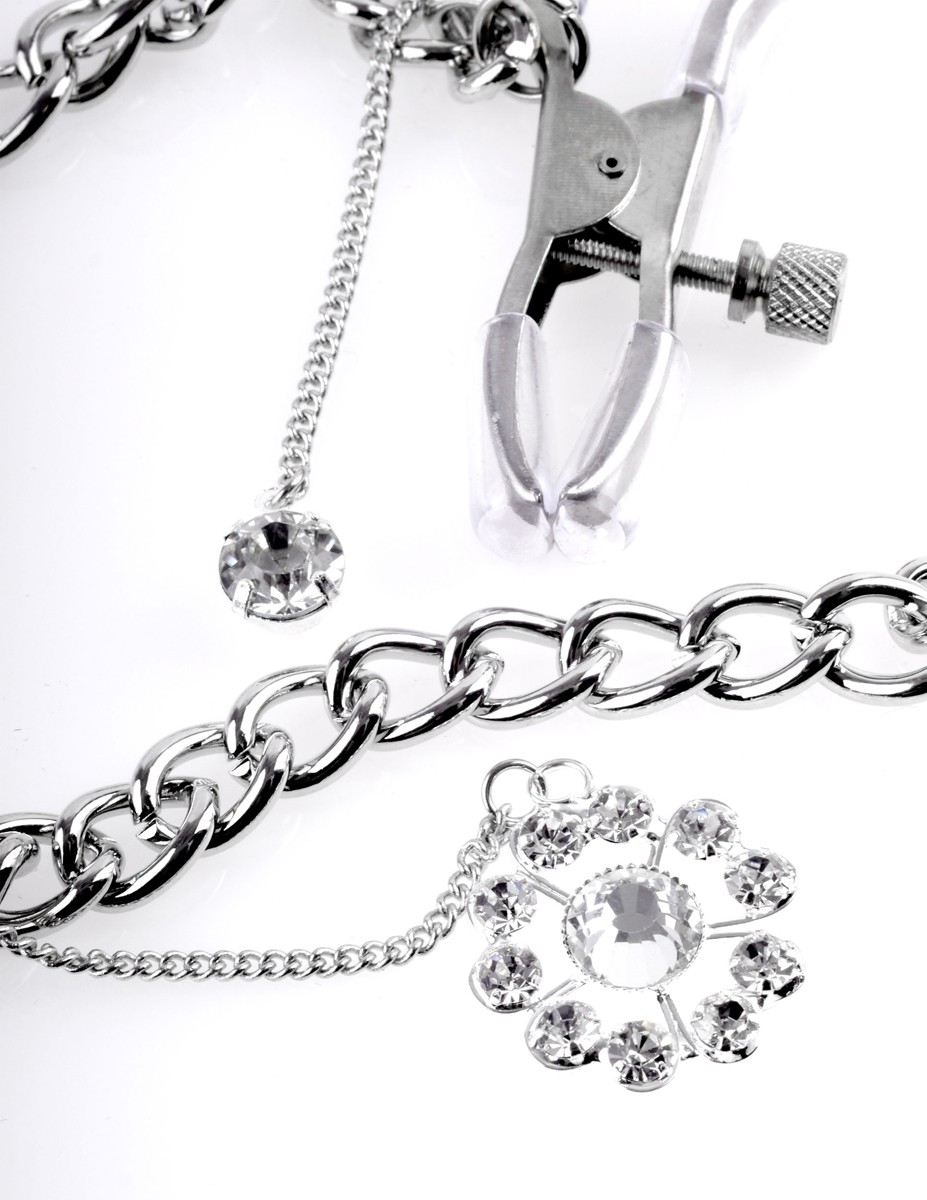 Ces pinces à seins de la marque Fetish Fantasy sont idéales pour stimuler les tétons et prendre du plaisir.Elles se composent de: les pinces qui s’ajustent avec vis des bijoux strass qui pendent sur chacune des pinces une chaîne en métal qui relie les deux avec un autre bijou strass. Idéales pour donner un look élégant et sexy