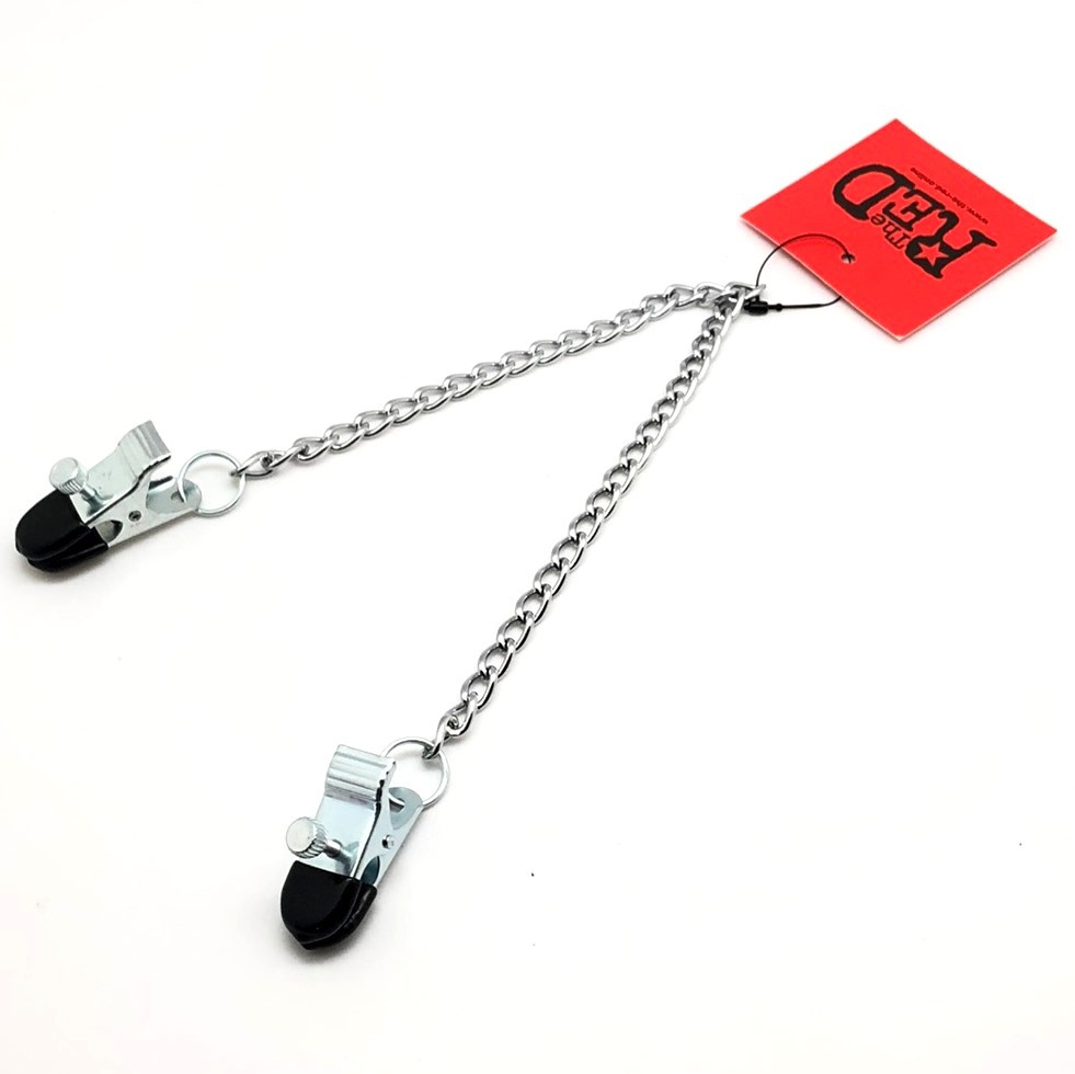 Pinces à seins métalliques avec chaineLongueur chaine : 30cmLongueur pince : 4cm x 0.9cmFabriqué en Europe