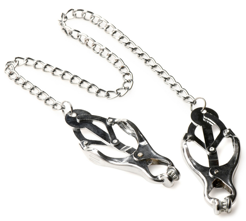 Pinces à tétons avec des picots en métal. Longueur de 8.5 cm et largeur de 3.5 cm. Chaîne de 38 cm. En métal.