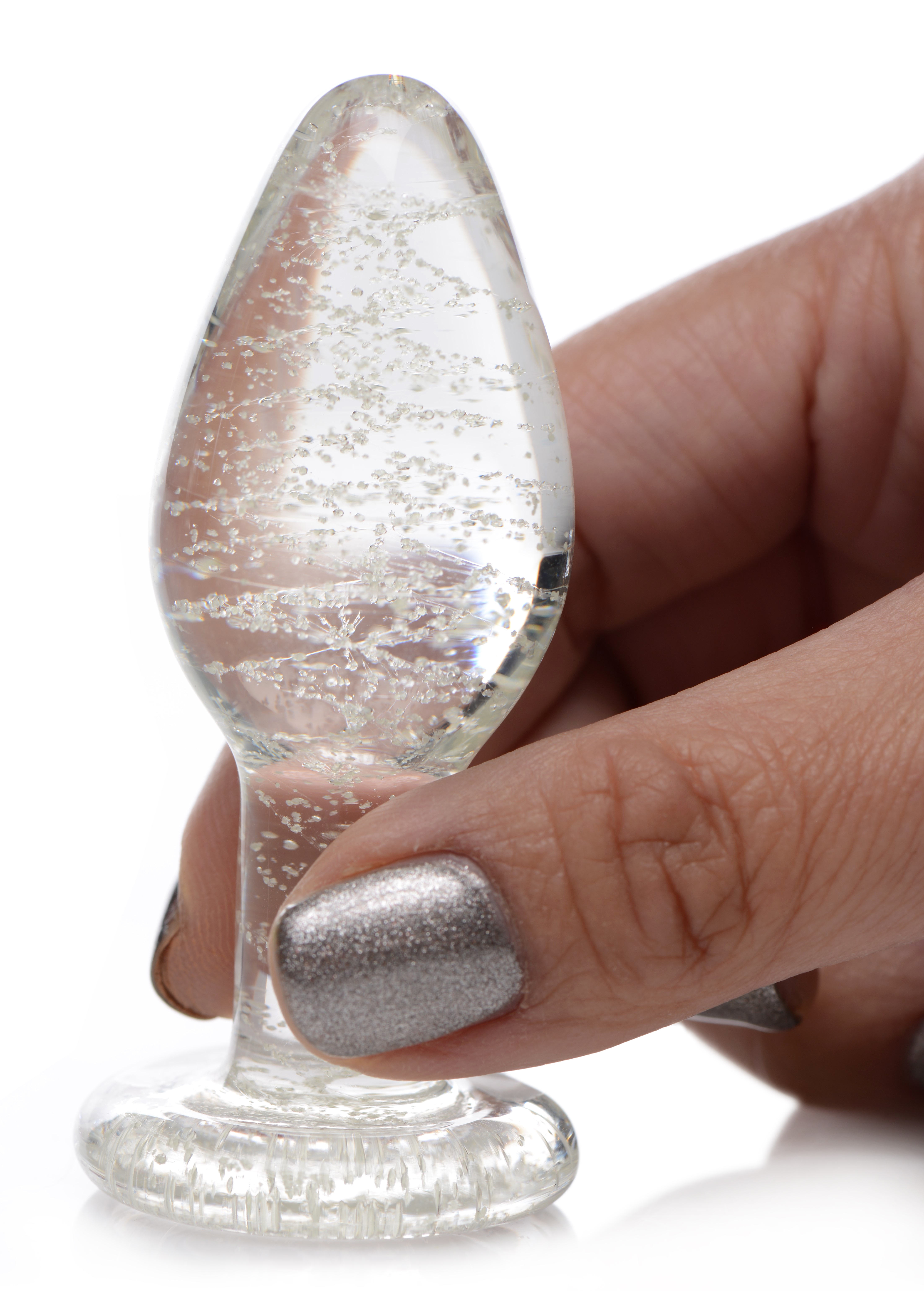 Ce plug en verre phosphorescent est un sextoy original composé de : une longueur insérable de 7cm la largeur maximale de 2.8cm les paillettes à l’intérieur qui brillent dans le noir. Avec une surface lisse et une base comme les plugs bijou