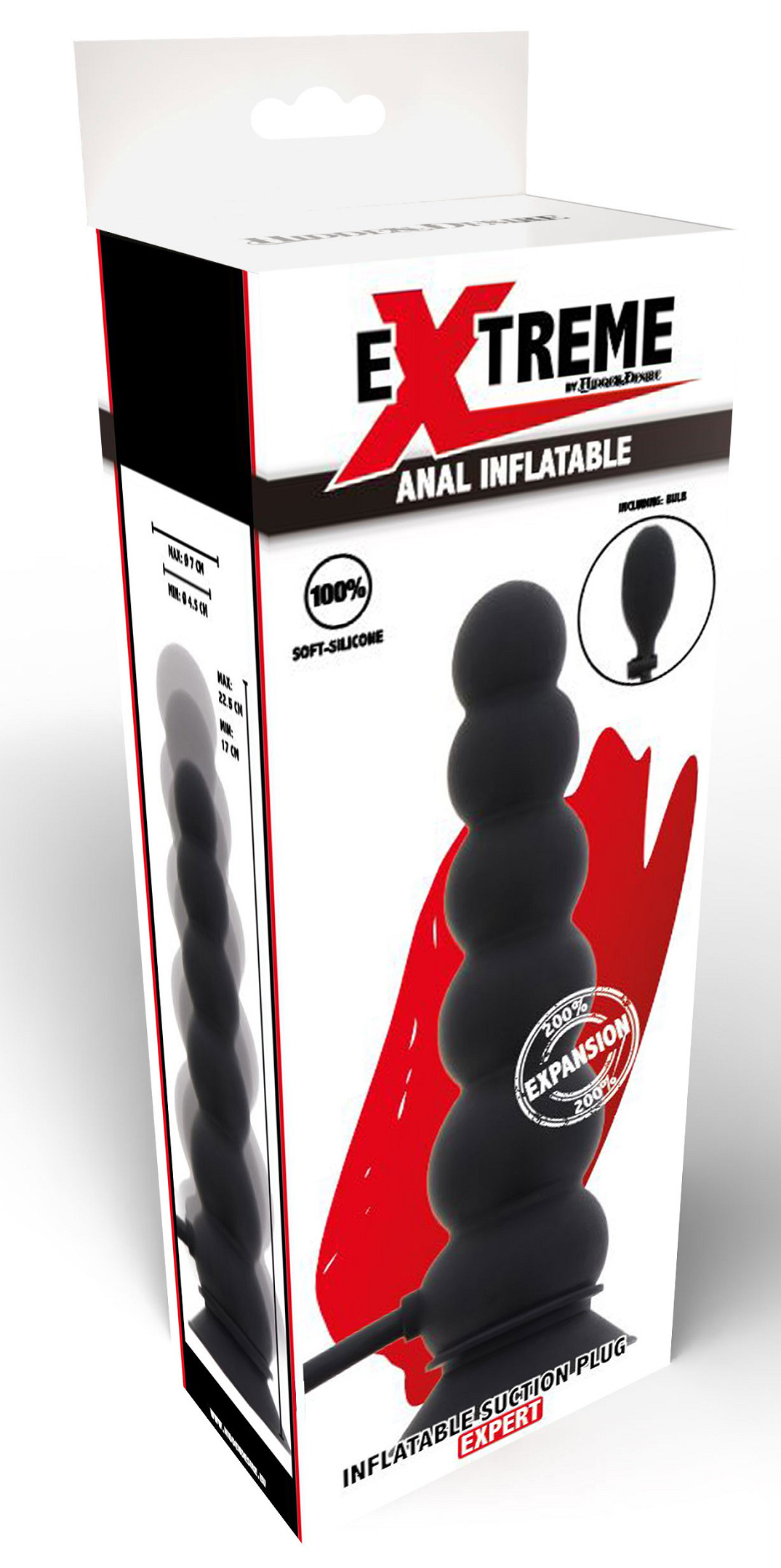 Plug gonflable avec une longueur insérable passant de 17 à 22 cm.La largeur va de 4.5 à 7 cm. Avec une base ventouse. En matière silicone