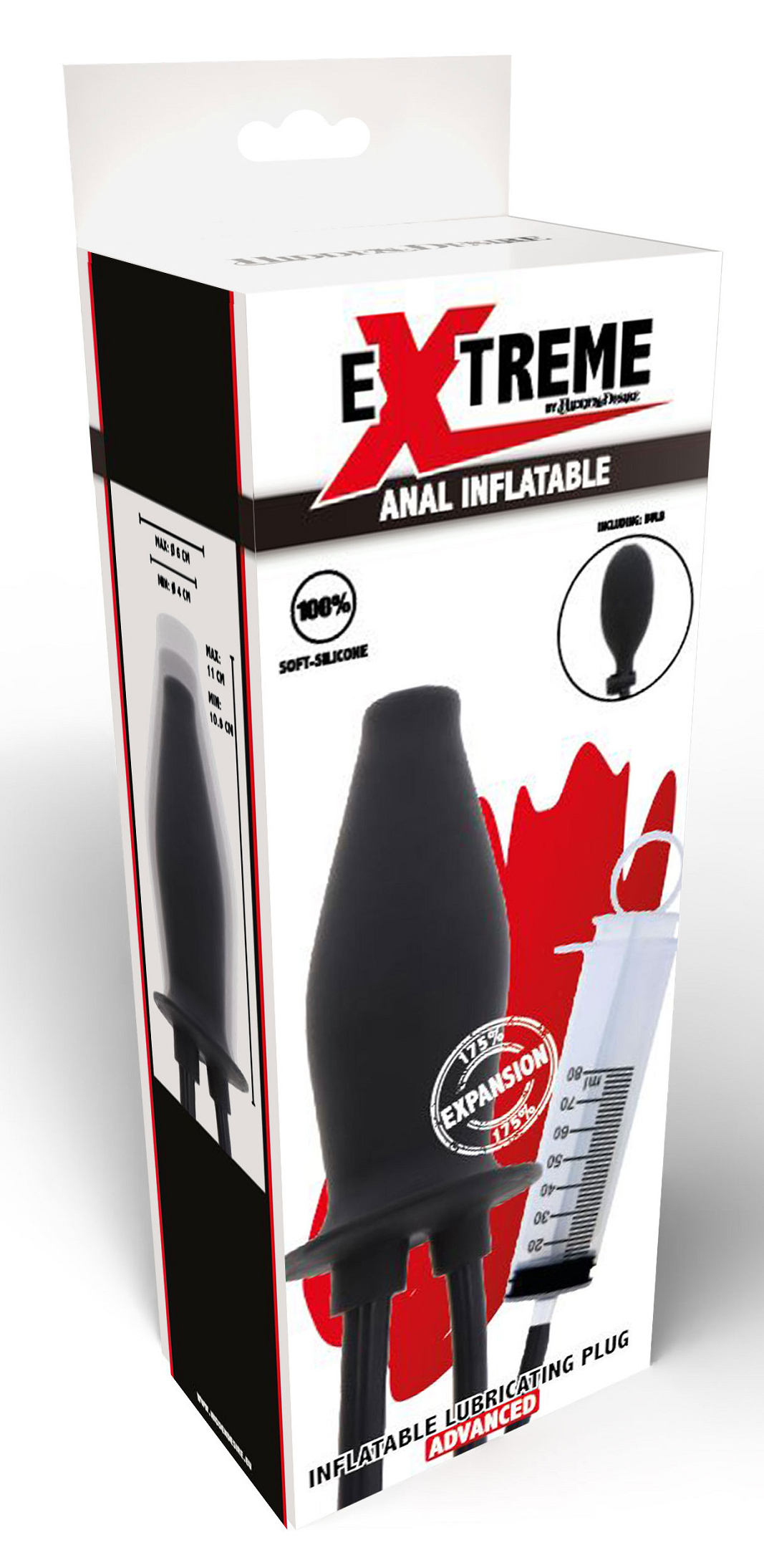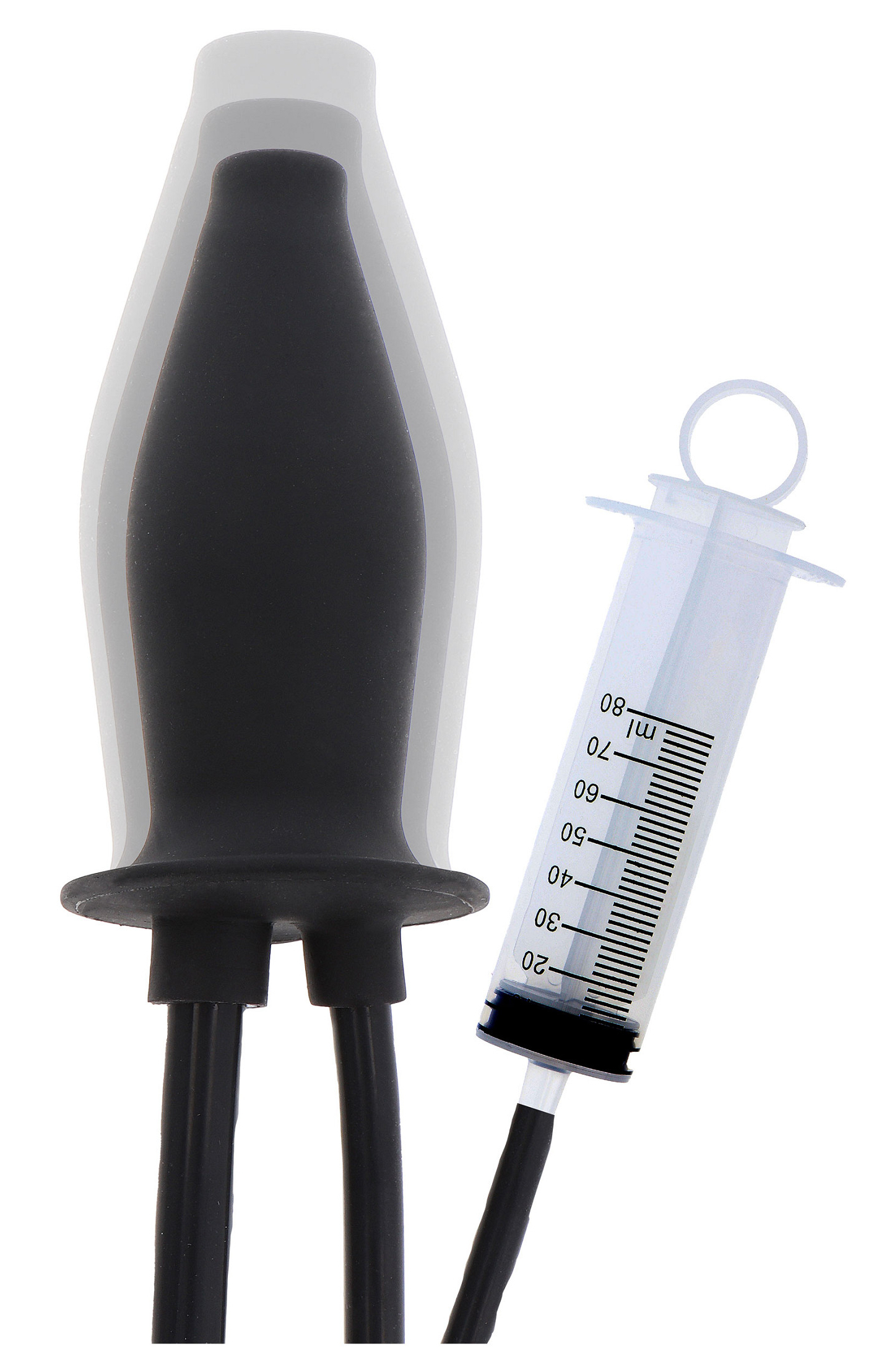 Plug gonflable avec un trou à l’extrémité permettant d’insérer du lubrifiant.Avec une seringue. Longueur allant de 10.5 à 11 cm.Largeur passant de 4 à 6 cm. En silicone