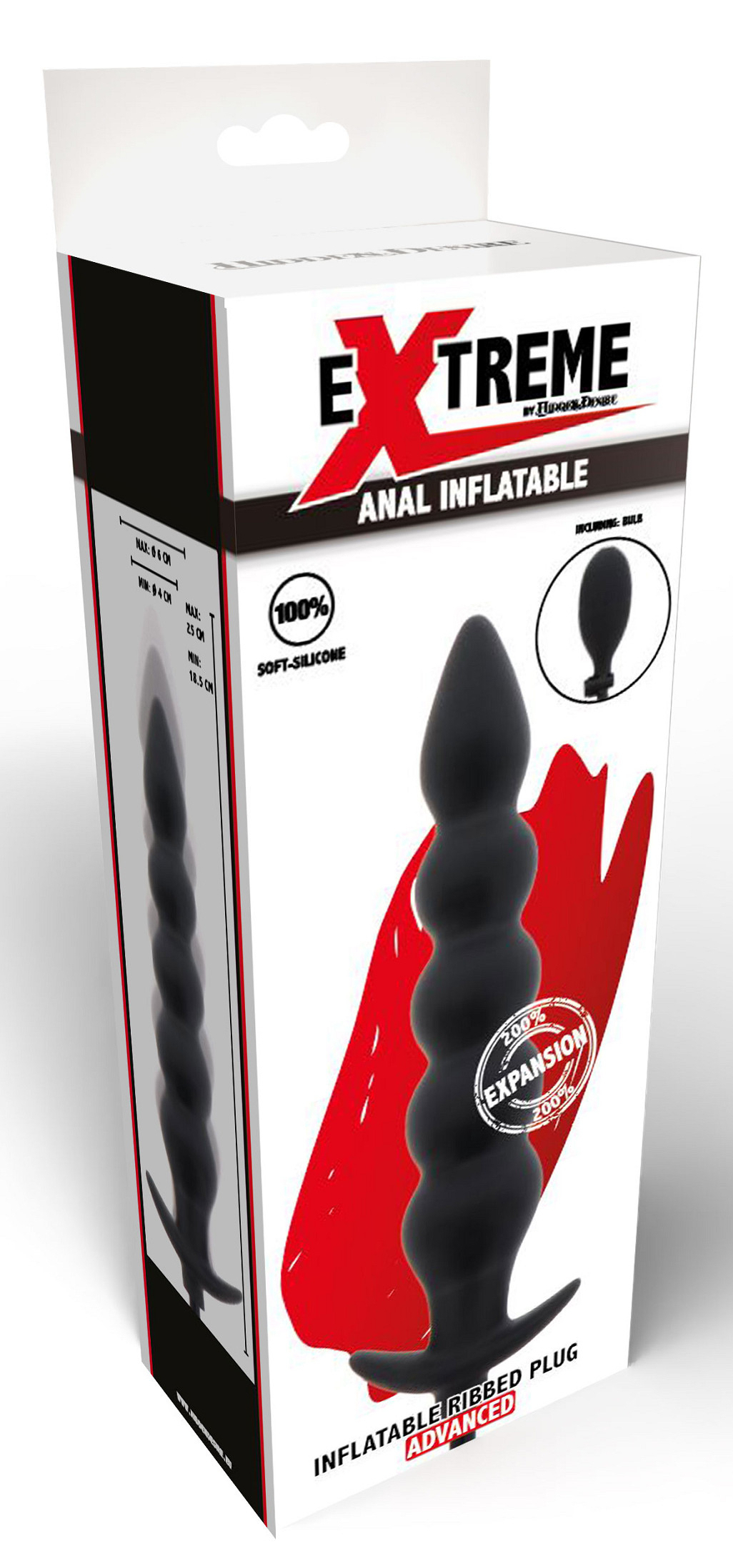 Plug gonflable avec une forme ondulée.La longueur de départ est de 18.5 cm. Elle atteint 25 cm.La largeur de départ est de 4 cm. Elle atteint 6 cm.En silicone