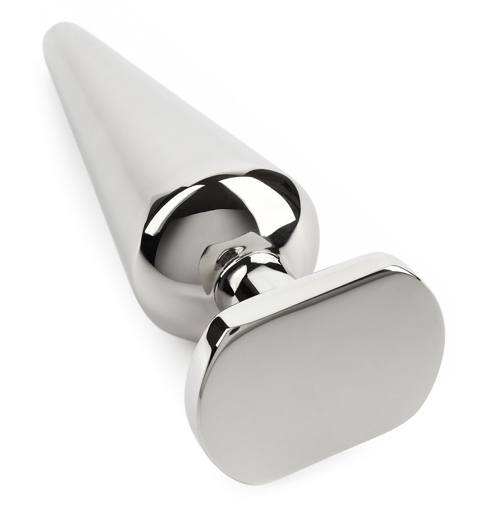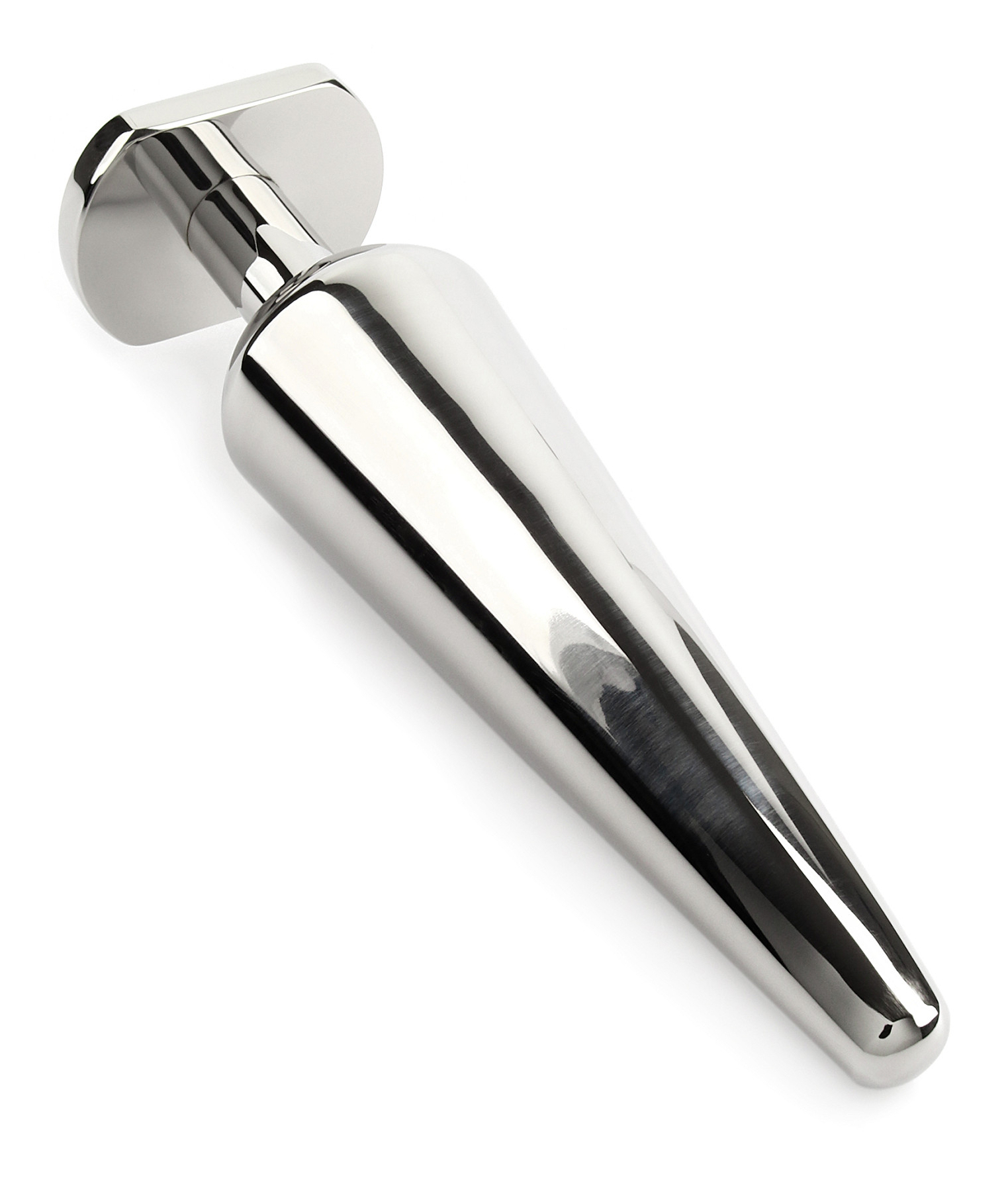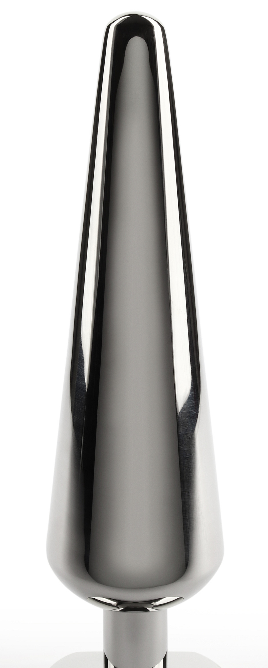 Plug en métal avec une longueur insérable de 14 cm.La largeur va de 1.5 à 3.7 cm et la surface est lisse.La partie resserrée fait 1.5 cm pour permettre de le garder inséré. Avec un poids de 590 grammes. En acier inox.