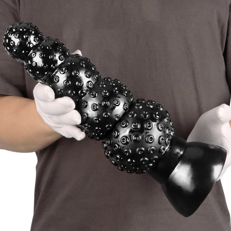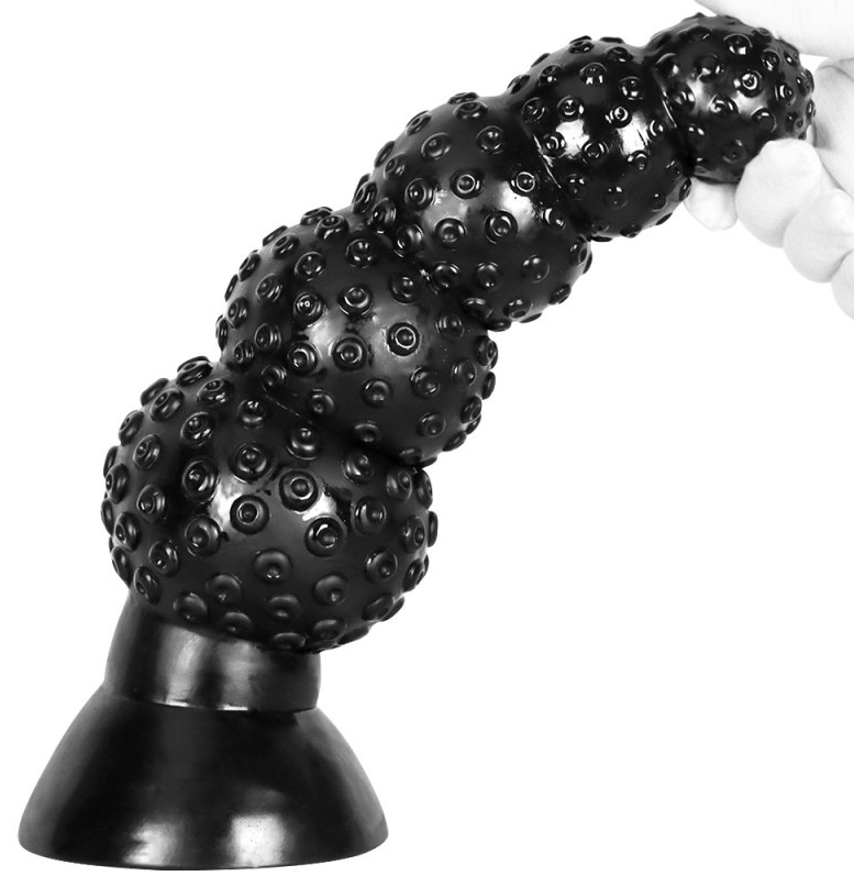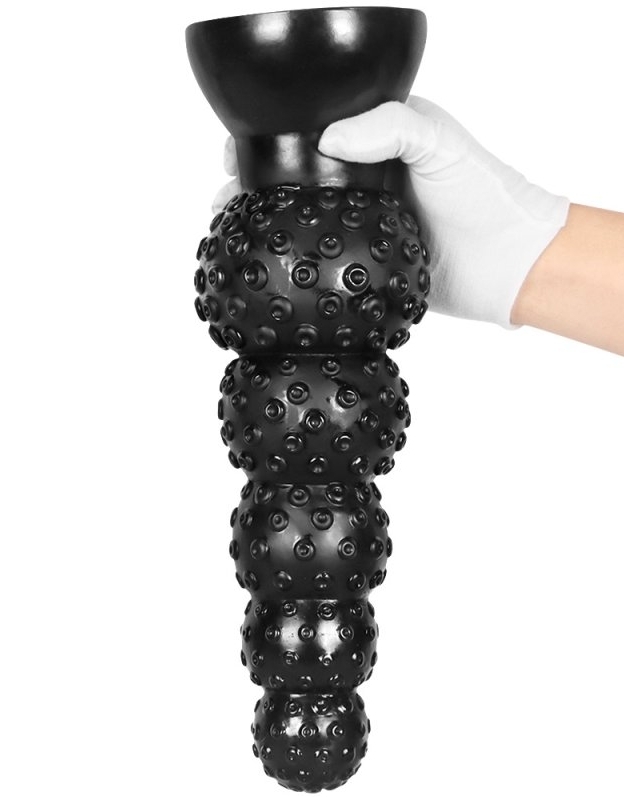 Le plug Pups M est un sextoy composé de 5 boules successives dont la largeur va de 5 à 10.5 cm. La surface est texturée avec des sortes de petites ventouses. La longueur insérable est de 30 cm. Avec une base ventouse. En PVC