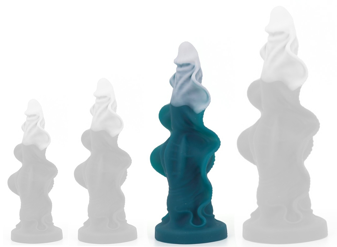 Forme originale et volumineuse.Longueur insérable de 22.5 cm et largeur évolutive : 2.7 cm, 8 cm et 10.5 cm maximum.Avec une base ventouse. En silicone.