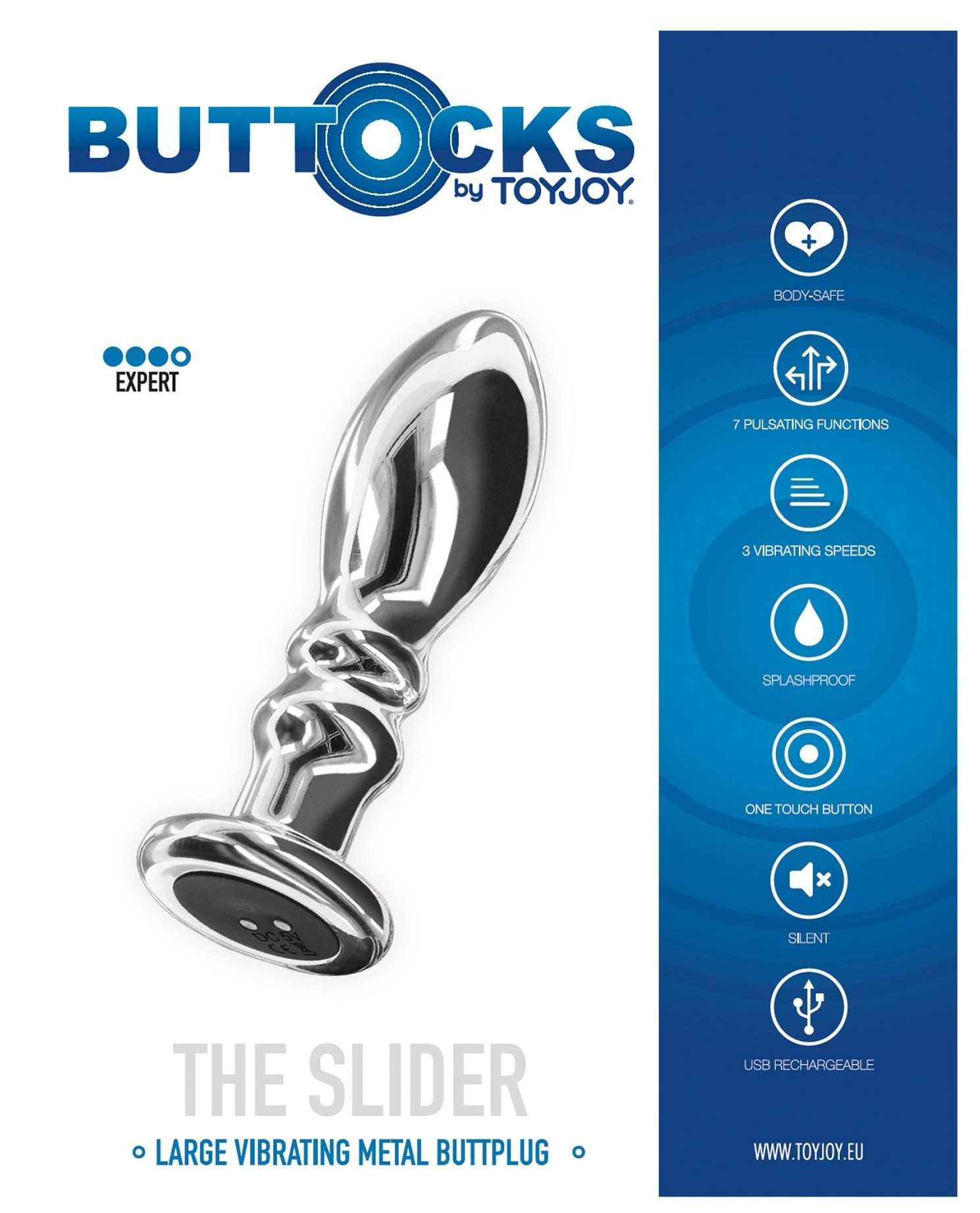 Plug vibrant avec 7 vibrations et 3 vitesses différentes.Longueur insérable de 10 cm. Largeur maximale de 3.3 cm. Recharge USB. En métal
