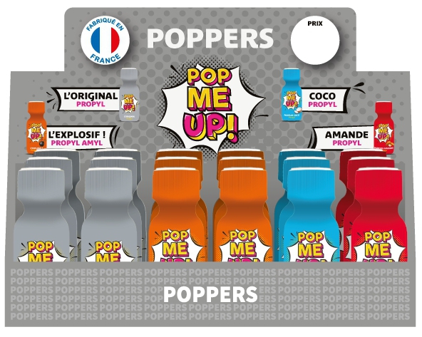 La gamme d’arômes Pop Me Up est proposée ici en boîte de 18 flacons.Avec 6 flacons Propyle, 6 flacons Amyle, 3 parfum Amande et 3 parfum Coco. Fabriqué en France