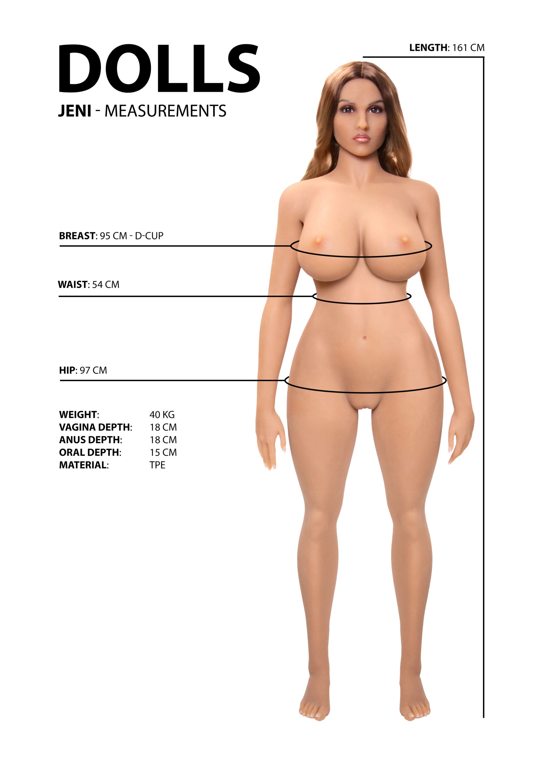 Longueur : 161 cmPoids : 40 kgPoitrine : Bonnet D (95 cm)Taille : 54 cmHanche : 97 cmTaille de chaussures : EU 36 / US 6 / UK 3.5Profondeur du vagin : 18 cmDiamètre du vagin : 5,5 cmProfondeur de l’anus : 18 cmDiamètre de l’anus : 5,5 cmProfondeur de la bouche : 15 cmDiamètre de la bouche : 3 cm