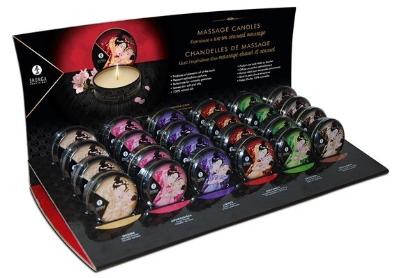 Présentoir avec 24 bougies de massage de la marque Shunga. 6 x 4 senteurs.Contenance 30ml