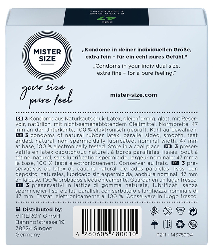Tailles des préservatifs : TAILLE LONGUEUR LARGEUR NOMINALE (à plat) ÉPAISSEUR 47 16cm 47mm 0.05mm 49 16cm 49mm 0.05mm 53 18.5cm 53mm 0.05mm 57 18.5cm 57mm 0.05mm 60 20cm 60mm 0.05mm 64 22cm 64mm 0.06mm 69 22cm 69mm 0.06mm Précautions d’utilisation : Lire la notice avant l’utilisation Le préservatif ne s’utilise qu’une seule fois Ne pas mettre deux préservatifs l’un sur l’autre Ne pas ouvrir avec les dents ou une paire de ciseaux Pour les préservatifs lubrifiés, Éviter tout contact avec les yeux Arrêter de l’utiliser en cas d’irritations, rougeurs ou signes d’allergie Ne pas utiliser en cas d’allergie au latex Ne pas utiliser en cas d’inflammation de la peau ou de blessures En cas de problèmes respiratoires ou un bleuissement des lèvres, interrompre immédiatement l’utilisation et appeler un médecin Aucune méthode de contraception ne peut garantir une protection efficace à 100% contre la grossesse, le virus du VIH ou les autres infections sexuellement transmissibles Testé dermatologiquement et électroniquement à 100% Conserver dans un endroit sec et à l’abri de la lumière Tenir hors de portée des enfants