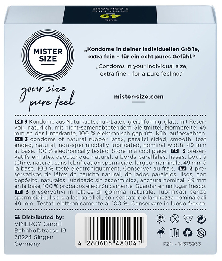 Ces préservatifs en latex de la marque MISTER SIZE sont proposés ici en version 49. Ils donnent du confort pendant le rapport sexuel en étant parfaitement adaptés aux dimensions du pénis.Avec une longueur de 16cm et une largeur nominale de 49mm.La forme est cylindrique avec un réservoir.