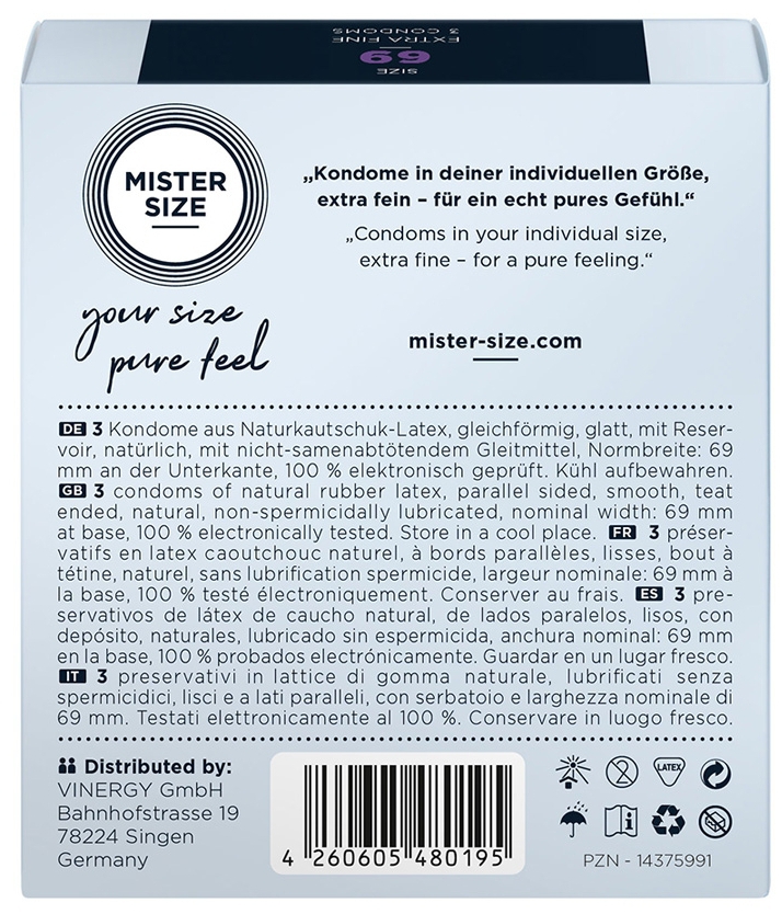 Ces préservatifs MISTER SIZE sont ici dans leur conditionnement 3 Préservatifs. Ils ont la taille 69 avec une longueur de 22cm et une largeur nominale de 69mm.Forme cylindrique et réservoir. Préservatifs en latex de caoutchouc naturel