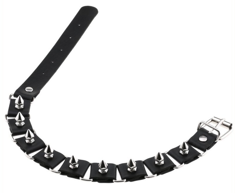 Ce ras de cou noir comporte des pointes en métal de 1cm.Avec plusieurs maillons carrés.Largeur de 2cm. Tour de cou de 34 à 42cm. En simili