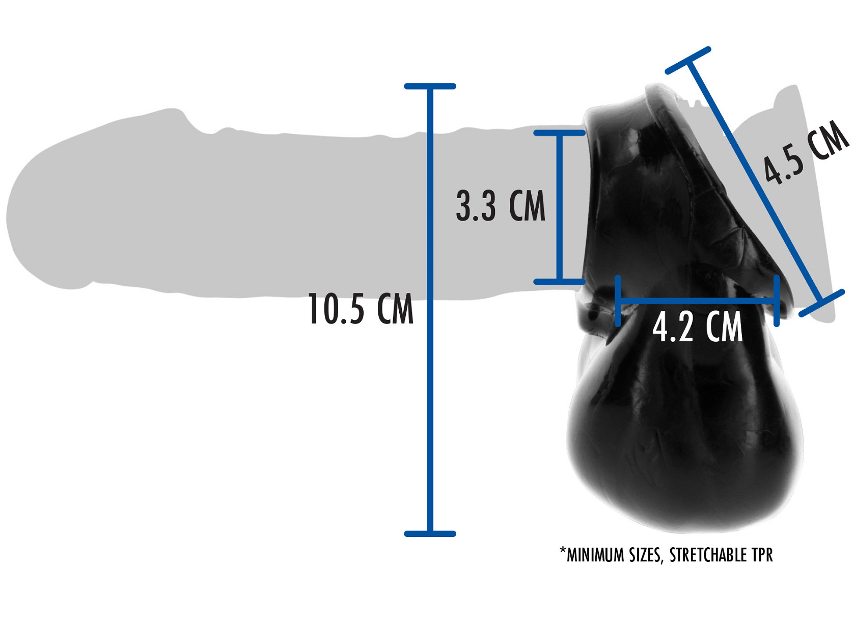 Dimensions : Dimensions totales 11 x 8 cm Ouvertures de 33 mm, 42 mm et 45 mm pour passer le pénis et les bourses. Précautions d’utilisation : Nettoyer avant la première utilisation Nettoyer après chaque utilisation Mettre une noisette de lubrifiant aqueux, si nécessaire, pour le positionner Conserver dans un endroit propre, sec et à l’abri de la chaleur, sans contact avec un autre objet.