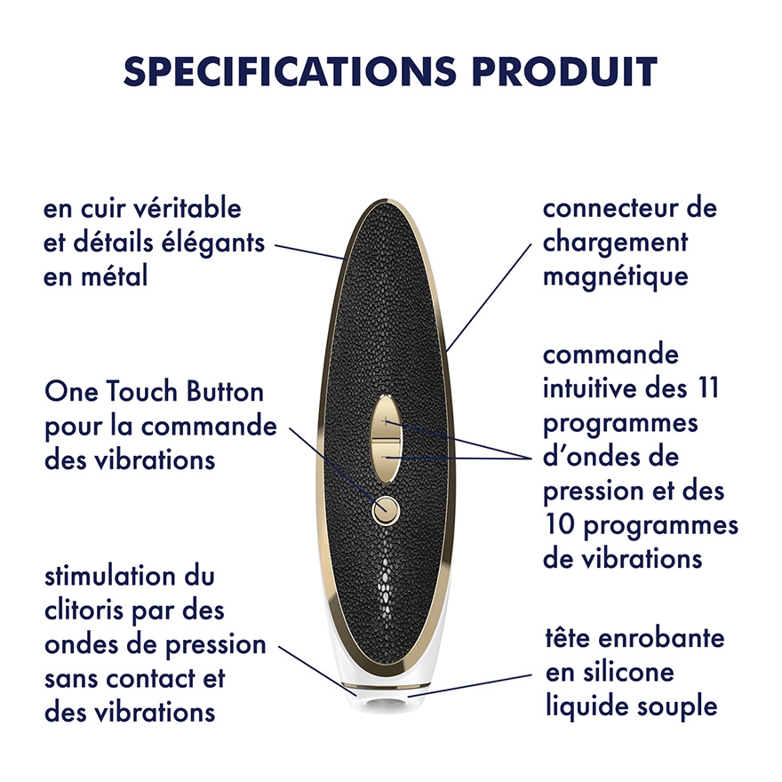 Le stimulateur clitoridien Haute couture est un sextoy féminin de la marque Satisfyer. Doté de 11 programmes d’ondes de pression que vous pourrez combiner aux 10 modes de vibrations qu’il possède, vous allez découvrir une nouvelle façon de stimuler le clitoris. Orgasmique, ce sextoy est également ergonomique et waterproof.Son look unique avec cuir véritable en font un accessoire de plaisir glamour