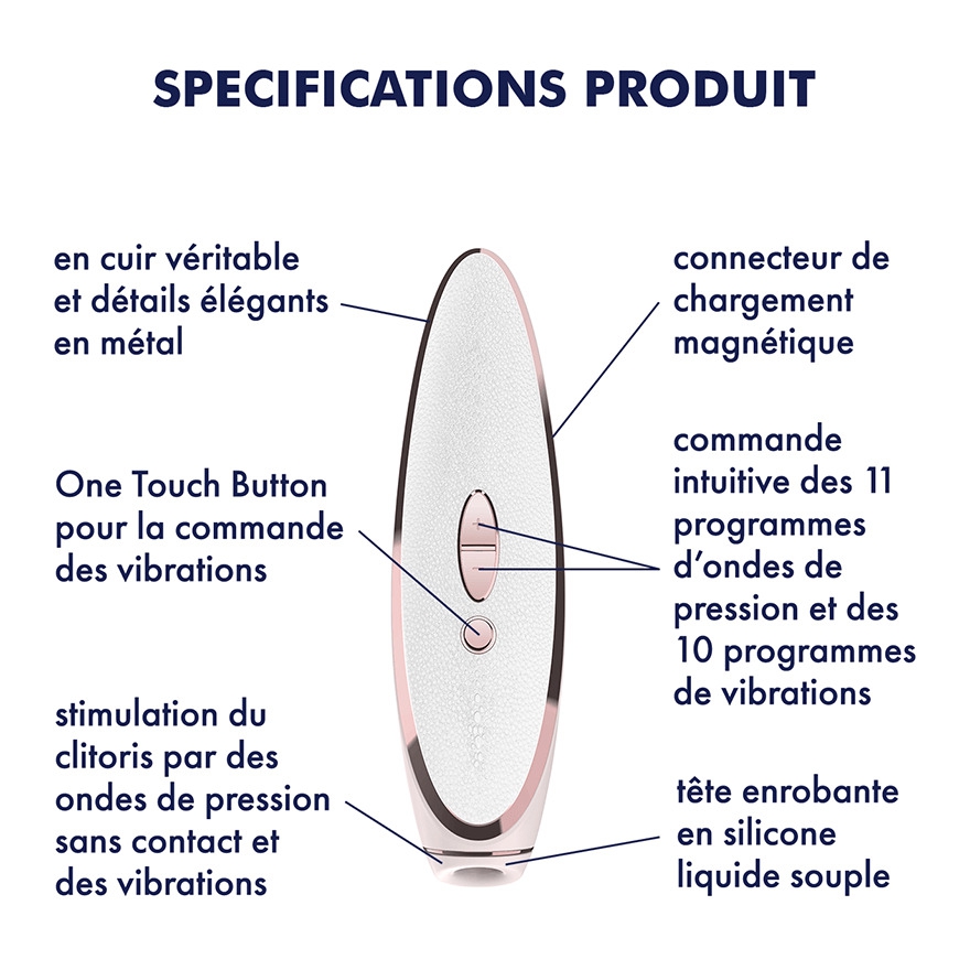 Recouvert d’une partie en cuir blanc et de commandes au métal rosé qui lui confère un look glamour et sexy, ce stimulateur clitoridien est un accessoire parfait pour vivre des sensations uniques.Doté de 2 moteurs, vous allez pouvoir contrôler séparément les différents programmes d’ondes de pressions mais également les différentes fonctions vibrantes pour ainsi varier les plaisirs Rechargeable, il est livré avec son câble USB magnétique. Dimensions du sextoy :Longueur: 18.5 cmLargeur: 5.5 cm