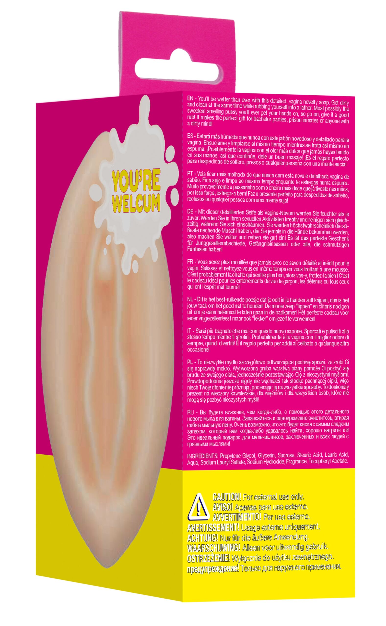 Ingrédients : Propylene Glycol, Glycerin, Sucrose, Stearic Acid, Lauric Acid, Aqua, Sodium Lauryl Sulfate, Sodium Hydroxide, Fragrance, Tocopheryl Acetate. Usage externe uniquement.