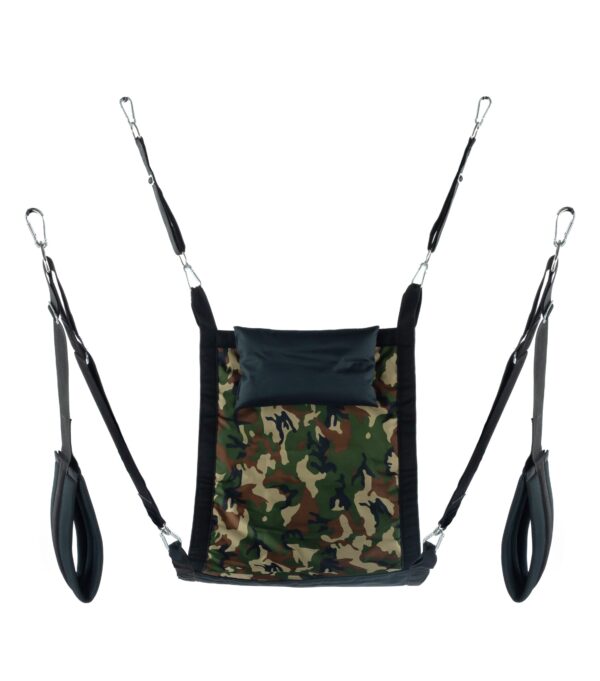 Ce sling en tissu est conçu avec une forme Rectangle.La couleur est kaki avec le motif Camouflage. Il est accompagné des accessoires : les 4 suspensions avec les mousquetons en métal les supports pour pieds rembourrés (largeur de 11cm) le coussin noir (23 x 38cm). Dimensions : 60cm X 107cm. Matière : polyester Avec le sac de rangement